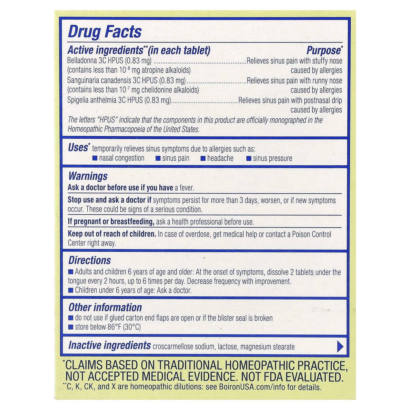 | Белладонна 3C HPUS (0,83 мг) (содержит менее10–8 мг атропиновых алкалоидов) Сангвинария канадская (Sanguinaria canadensis) 3C HPUS (0,83 мг) (содержит менее10–7 мг хелидониновых алкалоидов) Spigelia anthelmia — 3C HPUS (0,83 мг) | Уменьшает боль в носовых пазухах и заложенность носа, вызванную аллергией Уменьшает боль в пазухах носа при насморке, вызванном аллергией С помощью постназального капания снимает боль в носовых пазухах, вызванную аллергией |
