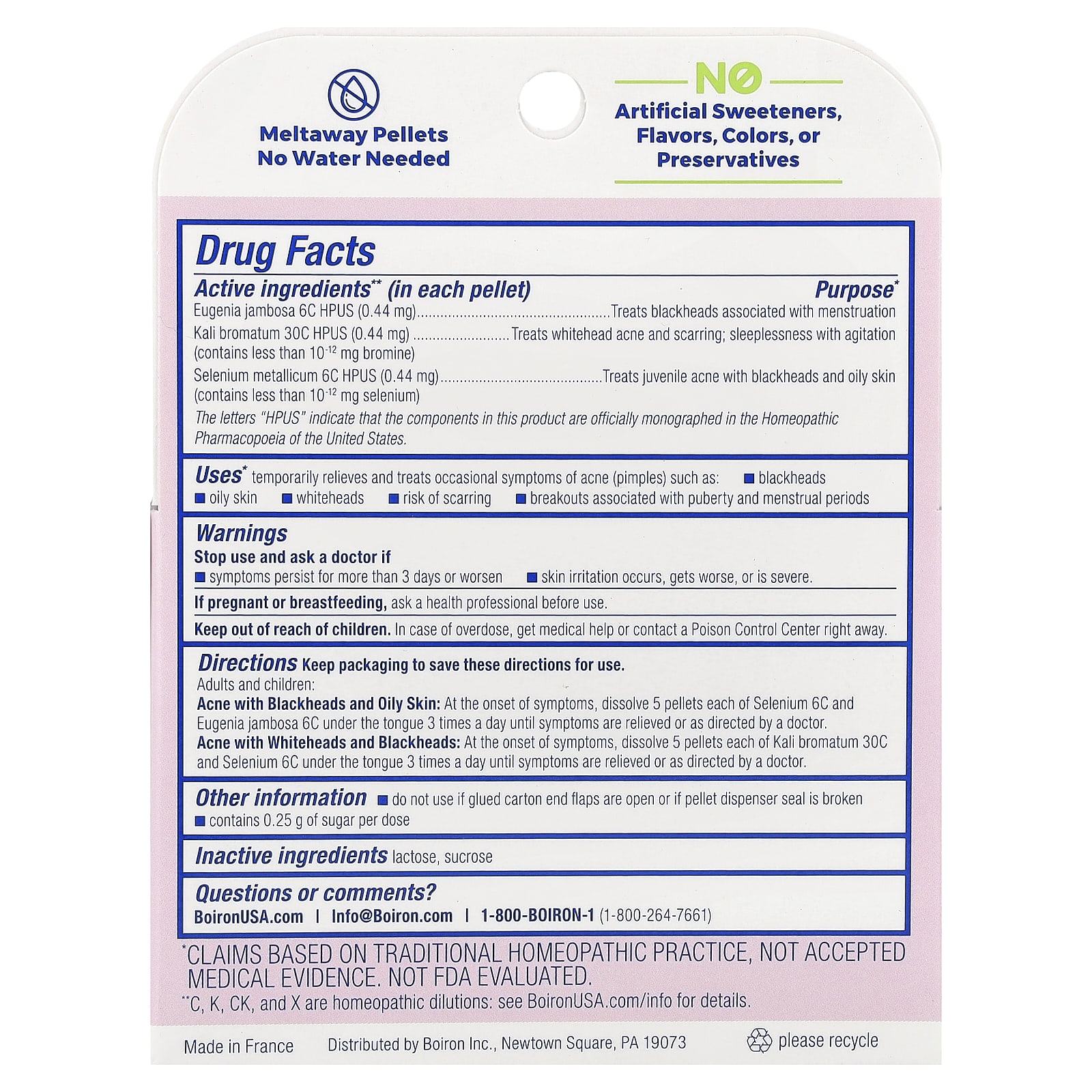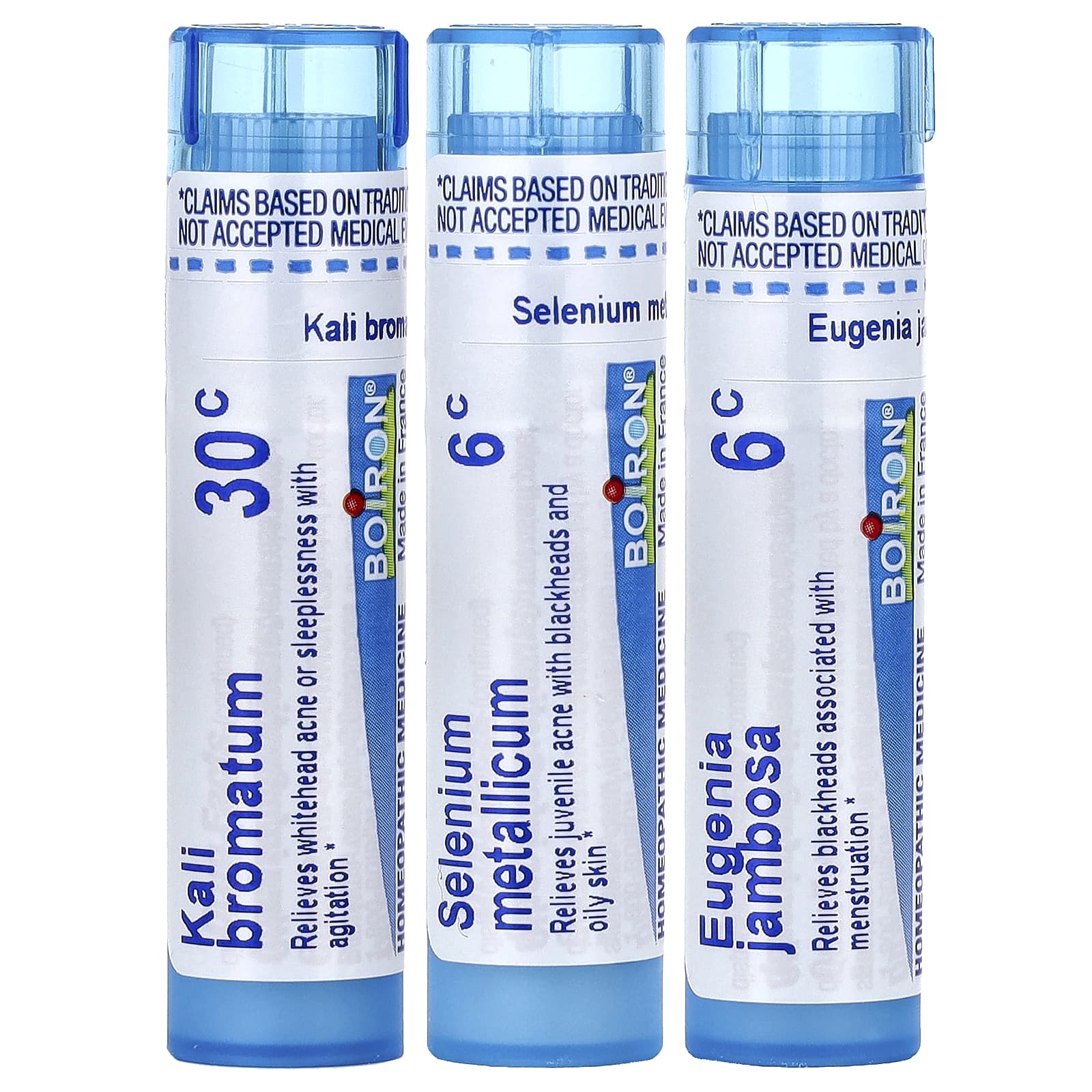 | Эвгения ямбоса (Eugenia Jabosa) 6C HPUS (0,44 мг) Броматум калия (Kali bromatum) 30C HPUS (0,44 мг) (содержит менее 10-12 мг брома) Селен металликум 6C HPUS (0,44 мг) (содержит менее 10-12 мг селена) | Борется с чёрными точками, связанными с менструацией устраняет акне и рубцы; бессонница с возбуждением Борется с юношеским акне, чёрными точками и жирной кожей. |