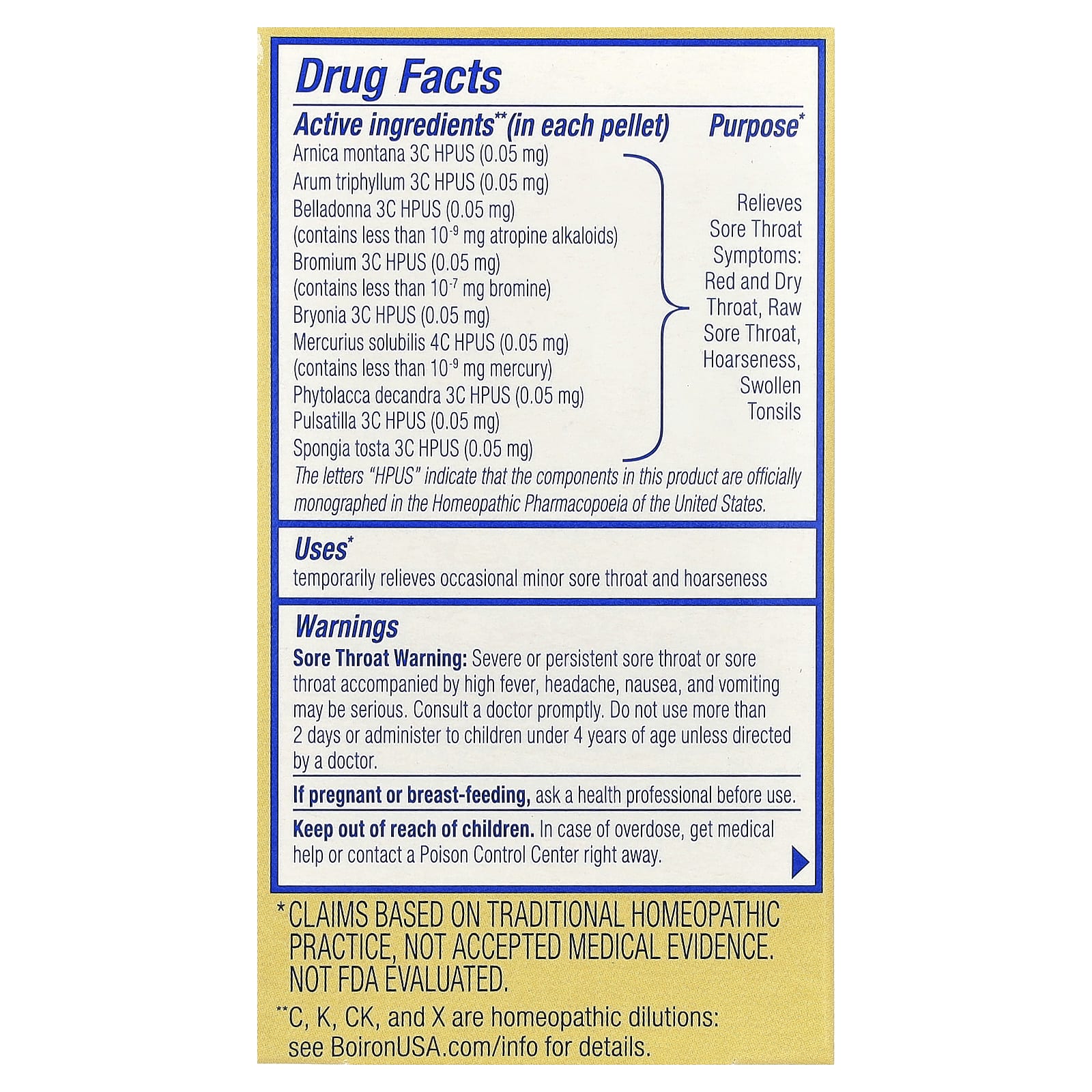 | Арника (Arnica montana) 3C HPUS (0,05 мг) Арум (Arum triphyllum) 3C HPUS (0,05 мг) Белладонна 3C HPUS (0,05 мг) (содержит менее 10- 9 мг атропиновых алкалоидов) Бром 3C HPUS (0,05 мг) (содержит менее 10- 7 мг брома) бриония 3C HPUS (0,05 мг) Mercurius solubilis 4C HPUS (0,05 мг) (содержит менее 10- 9 мг ртути) Phytolacca decandra 3C HPUS (0,05 мг) Сон-трава 3C HPUS (0,05 мг) Spongia tosta 3C HPUS (0,05 мг) | Снимает боль в горлеПокраснение и сухость в горле, боль в горле, охриплость голоса, опухшие миндалины |