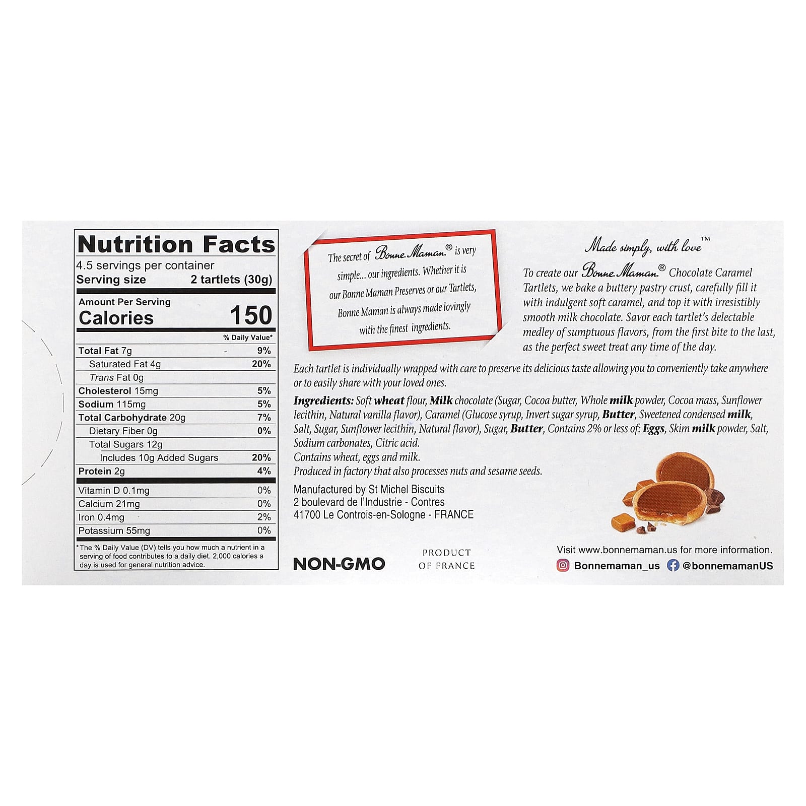 Для создания шоколадно-карамельных тарталеток Bonne Maman® мы выпекаем маслянистую корочку из теста, аккуратно наполняем ее нежной мягкой карамелью и посыпаем невероятно гладким молочным шоколадом. Наслаждайтесь восхитительной смесью роскошных вкусов каждой тарталетки, от первого укуса до последнего, в качестве идеального сладкого угощения в любое время дня.