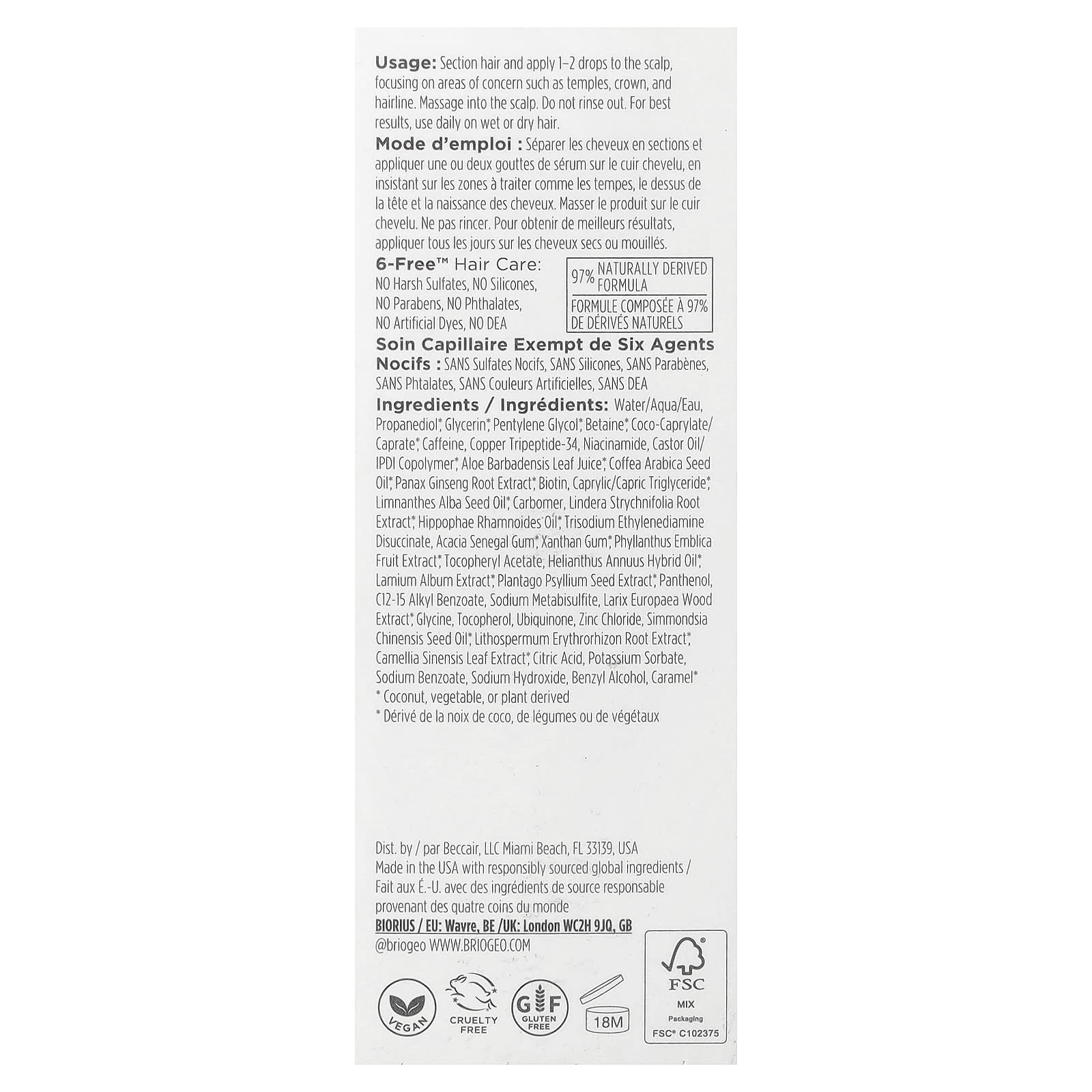 Вода, пропандиол*, глицерин*, пентилен гликоль*, бетаин*, коко-каприлат/капрат*, кофеин, трипептид меди-34, никотинамид, касторовое масло/изофорон диизоцианата сополимер*, сок листьев алоэ вера (Aloe barbadensis)*, масло из семян кофе арабика (Coffea arabica)*, экстракт корня женьшеня обыкновенного (Panax ginseng)*, биотин, каприловый/каприновый триглицерид*, масло из семян рейнутрии белой (Limnanthes alba)*, карбомер, экстракт корня Линдеры полосатой (Lindera Strychnifolia)*, масло облепихи (Hippophae rhamnoides)*, тринатрия этилендиамин дисукцинат, камедь акации сенегальской*, ксантановая камедь*, экстракт плодов амлы (Phyllanthus emblica)*, токоферилацетат, масло гибридной добавки (Helianthus annuus)*, экстракт лаванды (Lactobacillus album)*, экстракт семян подорожника (Plantago psyllium)*, пантенол, c12-15 алкил бензоат, метабисульфит натрия, экстракт древесины лиственницы европейской (Larix europaea)*, глицин, токоферол, убихинон, хлорид цинка, масло семян жожоба (Simmondsia chinensis)*, экстракт корня воробейника (Lithospermum erythrorhizon)*, экстракт листьев зеленого чая (Camellia sinensis)*, лимонная кислота, сорбат калия, бензоат натрия, гидроксид натрия, бензиловый спирт, карамель*.