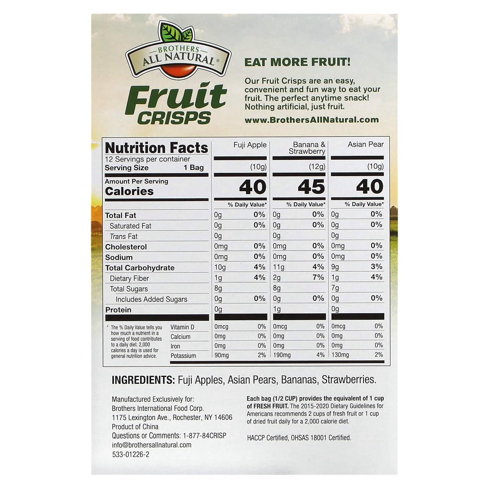 Каждый пакетик (1/2 стакана) содержит эквивалент 1 стакана свежих фруктов. В Рекомендациях по питанию для американцев на 2015–2020 гг. сказано принимать 2 стакана свежих фруктов или 1 стакан сухофруктов в день при употреблении 2000 калорий в день.