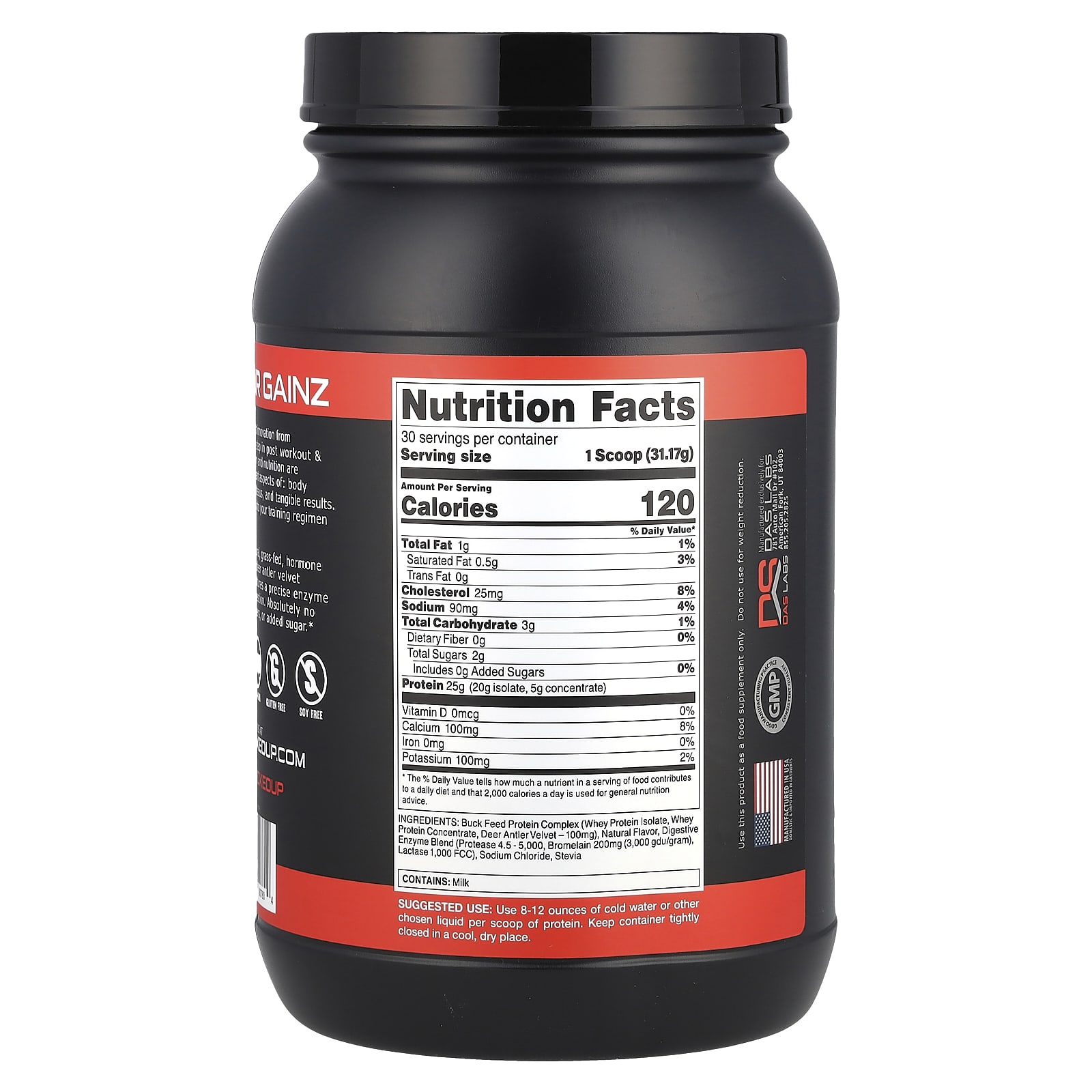 Buck Feed Protein Complex (изолят сывороточного протеина, концентрат сывороточного протеина, оленьи рога бархатные - 100 мг), натуральный ароматизатор, смесь пищеварительных ферментов (протеаза 4,5–5 000, бромелаин 200 мг (3000 гду / грамм), лактаза 1000 fcc), хлорид натрия, стевия.
