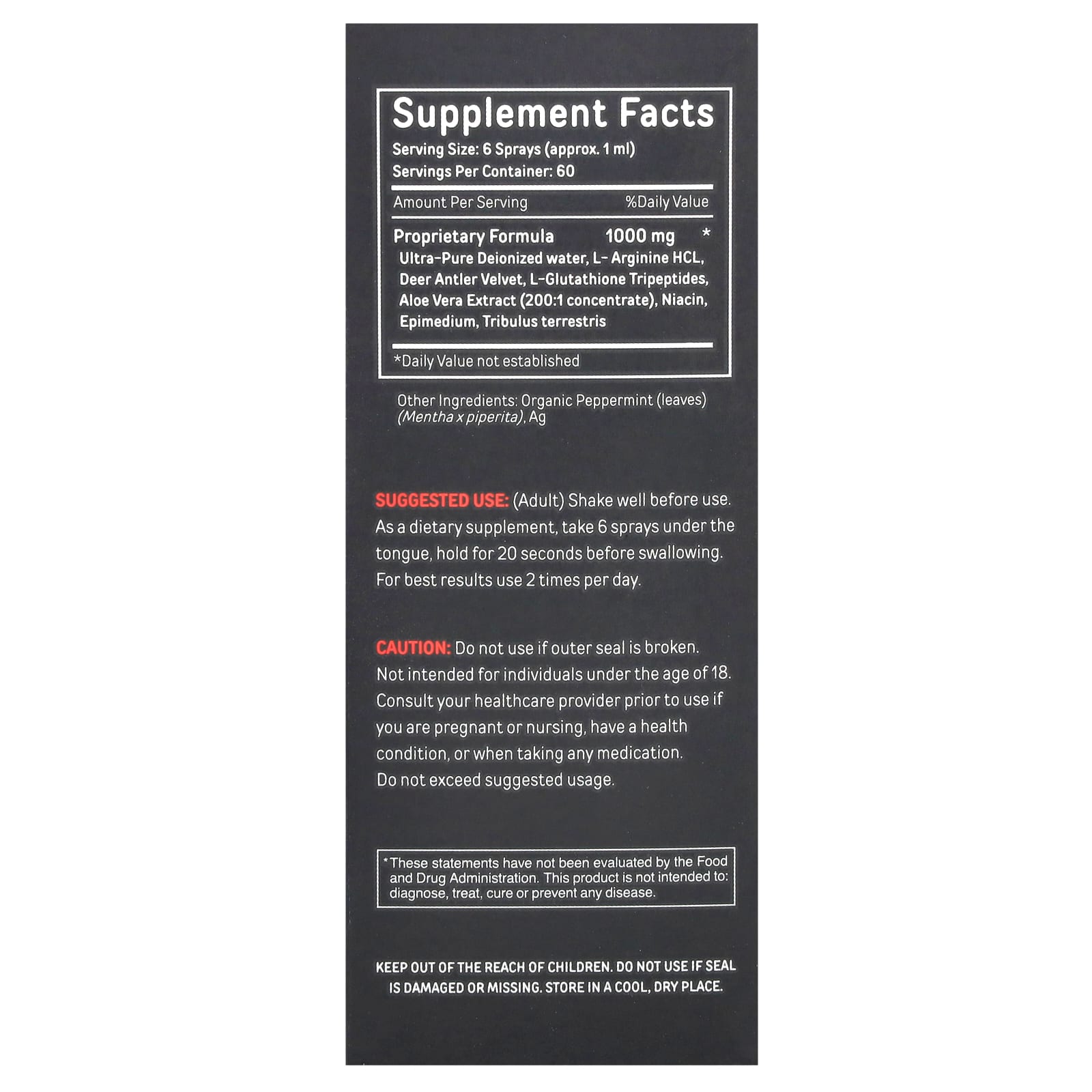 | Запатентованная формула Сверхчистая деионизированная вода, L-аргинин гидрохлорид, бархат из оленьих рогов, L-глутатион трипептиды, экстракт алоэ вера (концентрат 200: 1), ниацин, эпимедиум, якорцы стелющиеся (Tribulus terrestris) | 1000 мг | * |
