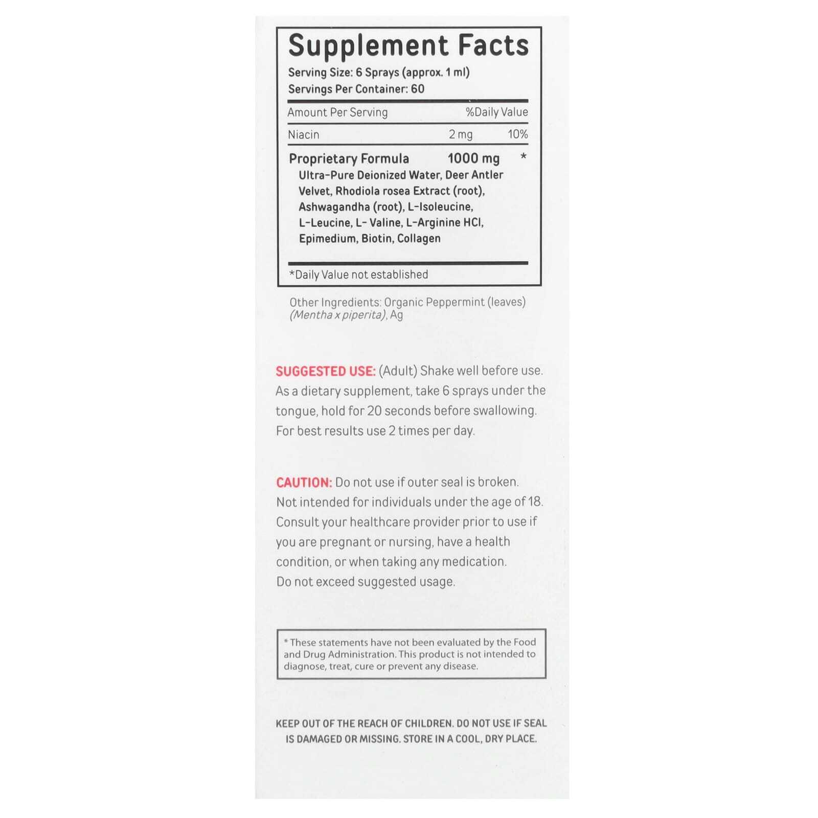 Запатентованная формула Ультрачистая деионизированная вода, бархат из оленьих рогов, экстракт родиолы розовой (корень), ашваганда (корень), L-изолейцин, L-лейцин, L-валин, L-аргинин гидрохлорид, эпимедиум, биотин, коллаген | 1000 мг | * |