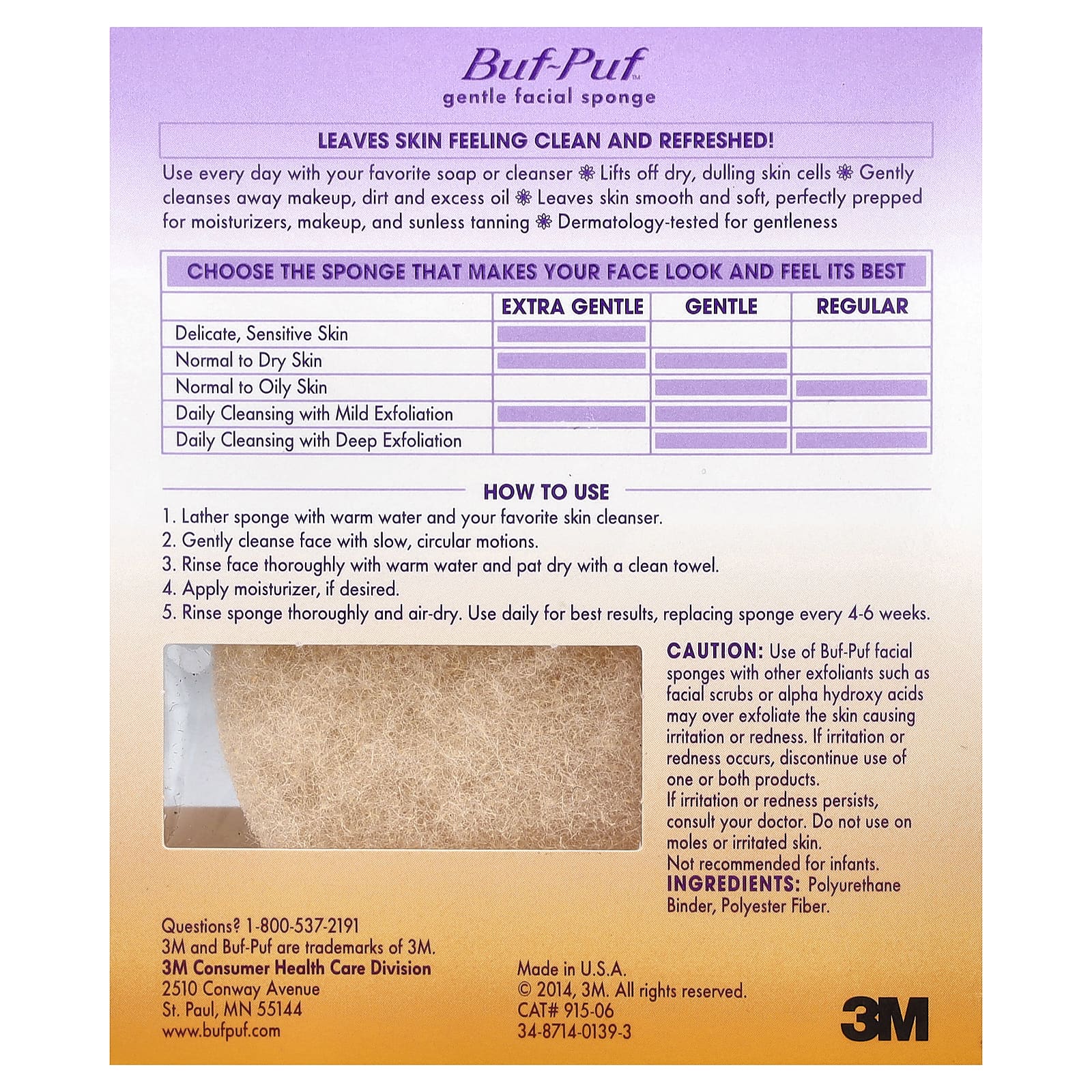 Использование спонжей для лица Buf-Puf с другими эксфолиантами, такими как скрабы для лица или альфа-гидроксикислоты, может чрезмерно отшелушивать кожу, вызывая раздражение или покраснение. При возникновении раздражения или покраснения прекратите использование одного или обоих продуктов.