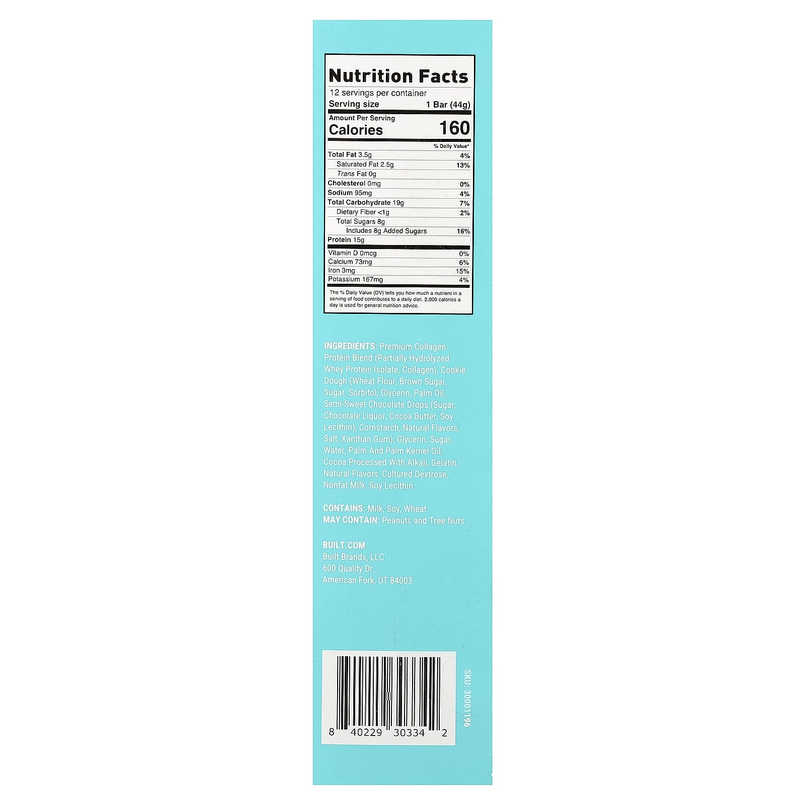 Протеиновая смесь коллагена премиального качества (частично гидролизованный изолят сывороточного протеина, коллагеном), тесто для печенья (пшеничная мука, коричневый сахар, сахар, сорбитол, глицерин, пальмовое масло, полусладкие шоколадные капли [сахар, тертое какао, какао-масло, соевый лецитин], кукурузный крахмал, натуральные ароматизаторы, соль, ксантановая камедь), глицерин, сахар, вода, пальмовое и пальмоядровое масло, обработанное щелочью какао, желатина, натуральные ароматизаторы, выращенная декстроза, обезжиренное молоко, лецитин из сои.