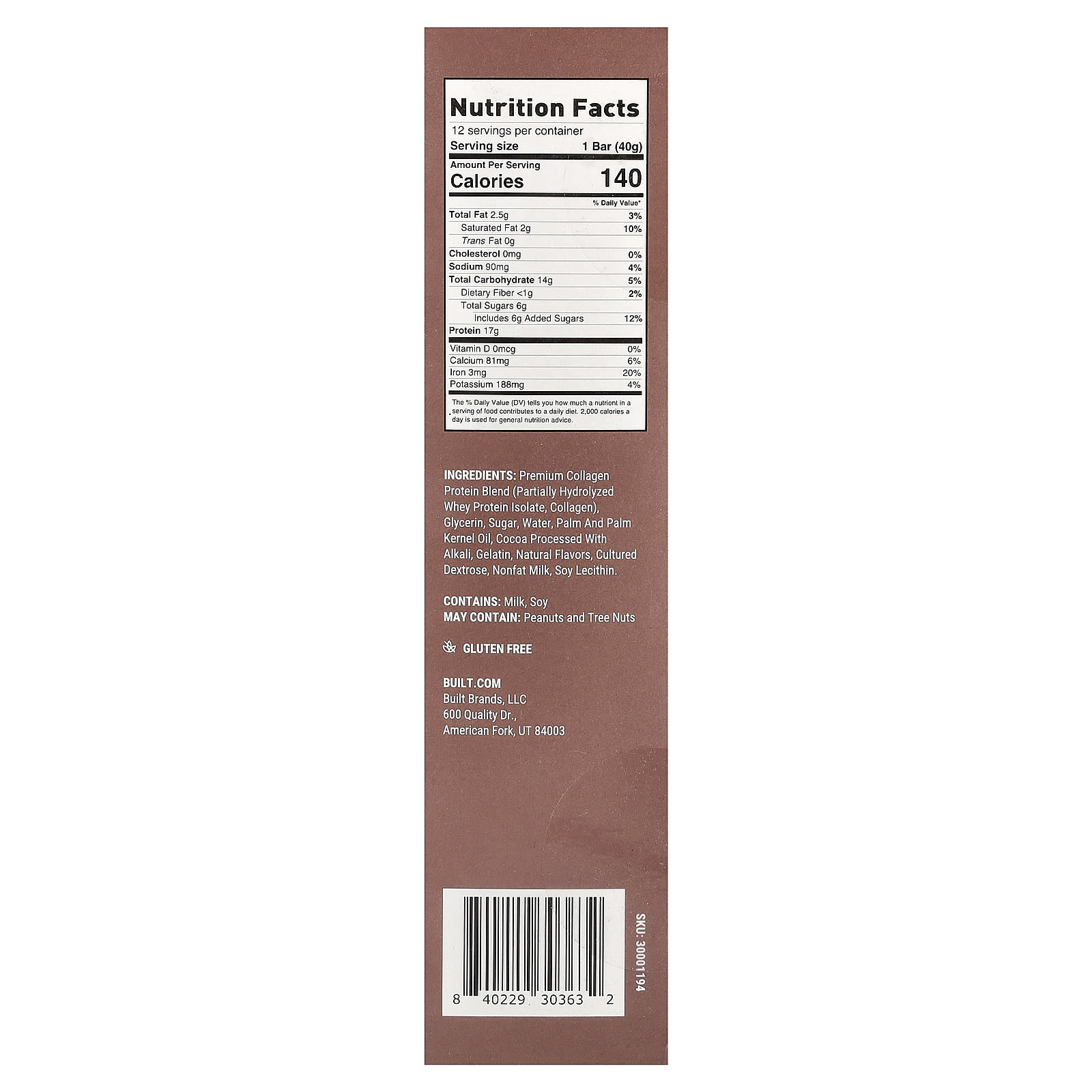 Протеиновая смесь коллагена премиального качества (частично гидролизованный изолят сывороточного протеина, коллагеном), глицерин, сахар, вода, пальмовое и пальмоядровое масло, обработанное щелочью какао, желатина, натуральные ароматизаторы, выращенная декстроза, обезжиренное молоко, лецитин из сои.