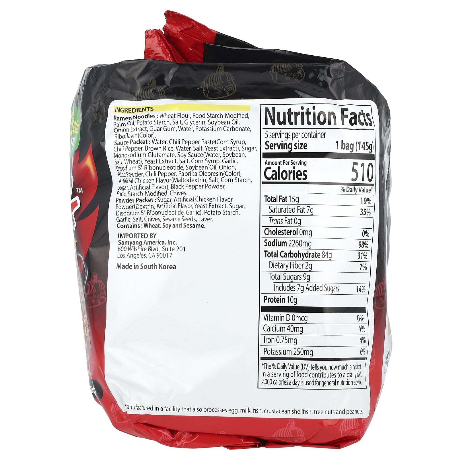 Пакетик соуса: Вода, паста из перца чили (кукурузный сироп, перец чили, коричневый рис, вода, соль, дрожжевой экстракт), сахар, однонатриевый глутамат, соевый соус (вода, соя, соль, пшеница), экстракт дрожжей, соль, кукурузный сироп, чеснок, динатрий 5'-рибонуклеотид, соевое масло, лук, рисовая пудра, перец чили, олеорезин паприки (краситель), искусственный куриный ароматизатор (мальтодекстрин, соль, кукурузный крахмал, сахар, искусственный ароматизатор], порошок черного перца, модифицированный пищевой крахмал, шнитт-лук.