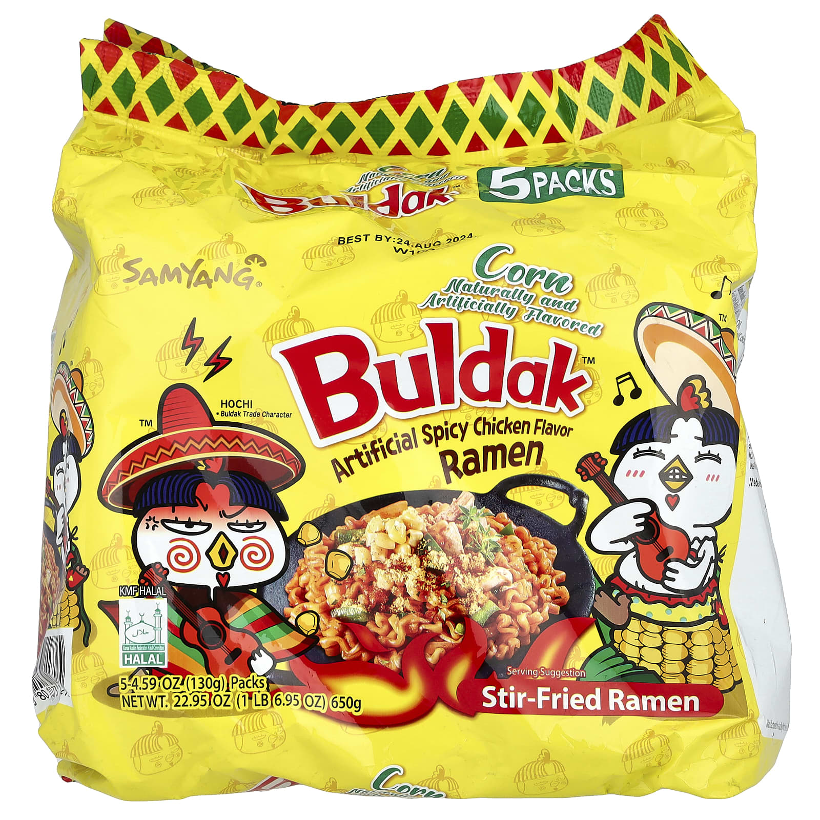 Лапша рамен: Пшеничная мука, пальмовое масло, пищевой с модифицированным крахмалом, соль, глицерин, соевое масло, гуаровая камедь, вода, карбонат калия, рибофлавин (краситель). пакетик соуса: вода, соевый соус (обезжиренные соевые бобы, вода, соль, пшеница), порошок с искусственным куриным вкусом (дрожжевой экстракт, декстрин, вода, кукурузный сироп, искусственный ароматизатор), сахара, перец чили, искусственный кукурузный ароматизатор, соевое масло, лук, глутамат натрия, чеснок, пищевой с модифицированным крахмалом, олеорезин паприки (краситель).