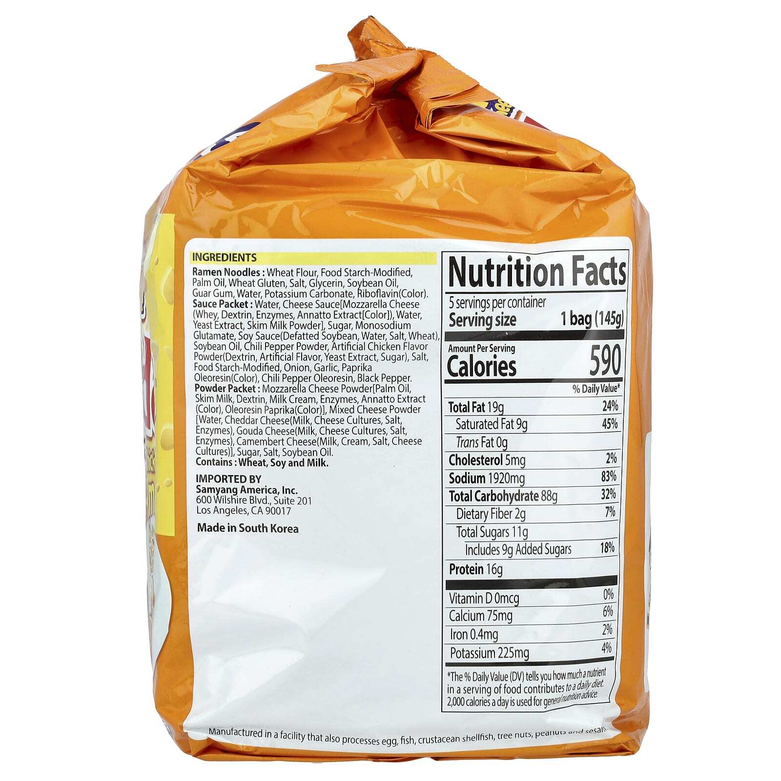 Пакетик соуса: Вода, сырный соус [моцарелла (сыворотка, декстрин, ферментов, экстракт аннато [краситель]), вода, экстракт дрожжей, сухое обезжиренное молоко], сахара, глутамат натрия, соевый соус (обезжиренные соевые бобы, вода, соль, пшеница) соевое масло, порошок из перца чили, порошок с искусственным куриным вкусом (декстрин, искусственных ароматизаторов, экстракт дрожжей, сахар), соль, пищевой с модифицированным крахмалом, лук, чеснок, олеорезин паприки (краситель), олеорезин перца чили, черный перец.