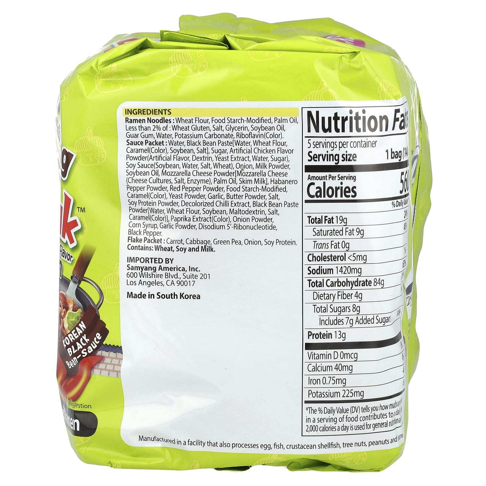 Лапша рамен: пшеничная мука, модифицированный пищевой крахмал, пальмовое масло, менее 2% пшеничной глютена, соль, глицерин, соевый лецитин, полиглицериновые эфиры жирных кислот, карбонат калия, карбонат натрия, натрия фосфат двухосновная гуаровая камедь, токоферолы, рибофлавин (краситель). Пакетик соуса: вода, паста из черной фасоли (пшеничная мука, сою, соль, вода, карамель), сахар, порошок искусственного куриного ароматизатора (искусственный ароматизатор, декстрин, сахар, соль, кукурузный крахмал, динатрия инозинат, гуанилат динатрия, порошок из яичного белка, декстроза безводная, чесночный порошок, дрожжевой экстракт), приправа из соевого соуса (соевые бобы, вода, соль, пшеницы, соляная кислота, карбонат натрия, гидроксид натрия, кукурузный сироп с высоким содержанием фруктозы, чеснок, динатрия инозинат, гуанилат динатрия, стевиолгликозиды, мальтодекстрин, сахар), лук, сухое цельное молоко, соевое масло, приправа для острого перца (красный перец декстрин, соль, сахар, луковый порошок, экстракт дрожжей, искусственных ароматизаторов, чесночный порошок, диоксид кремния, соевый соус [вода, сою, пшеницы, соль], стручковый перец, паприка, динатрия инозинат, динатрий гуанилат), смешанный порошок сыра (сыр моцарелла [молоко, культуры сыра, соль, ферменты], сливки, сухое обезжиренное молоко, полифосфат натрия, фосфат натрия трехосновный, лактозы, паприка, пальмовое масло, декстрин, казеинат натрия, сыр чеддер [молоко, культуры сыра, соль, ферменты], сывороточный порошок, уровня молочной кислоты, глицериновые эфиры жирных кислот, экстракт аннато (краситель), искусственный ароматизатор], менее 2% пищевых добавок, модифицированных крахмалом, карамель (краситель), экстракт дрожжей, чеснок, масло, соль, соевый протеин, стручковый перец, порошок пасты из черной фасоли (вода, пшеничная мука, сою, мальтодекстрин, соль, кукурузное масло, карамель (краситель), моногидрат декстрозы), олеорезин паприки (краситель), луковый порошок, кукурузный сироп, чесночный порошок, динатрия инозинат, гуанилат динатрия, порошок черного перца, карбонат калия, карбонат натрия, динатрия фосфат, пирофосфат натрия. Пакетик хлопьев: морковные хлопья, капустные хлопья, сублимированный зеленый горошек, луковые хлопья, соевый протеин в хлопьях.