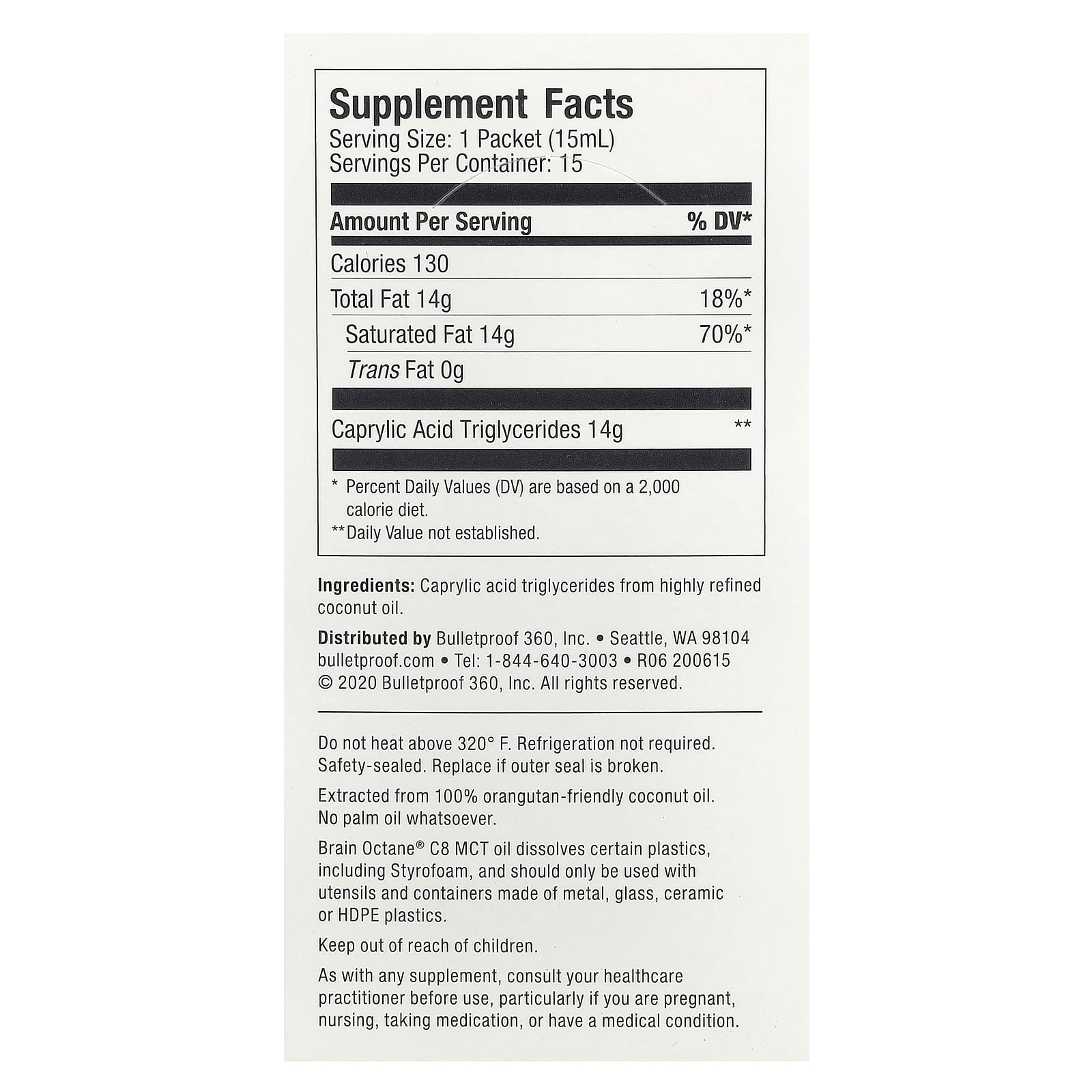 Масло Brain Octane® C8 MCT растворяет некоторые пластмассы, включая пенополистирол, и его следует использовать только с посудой и емкостями из металла, стекла, керамики или пластика HDPE.