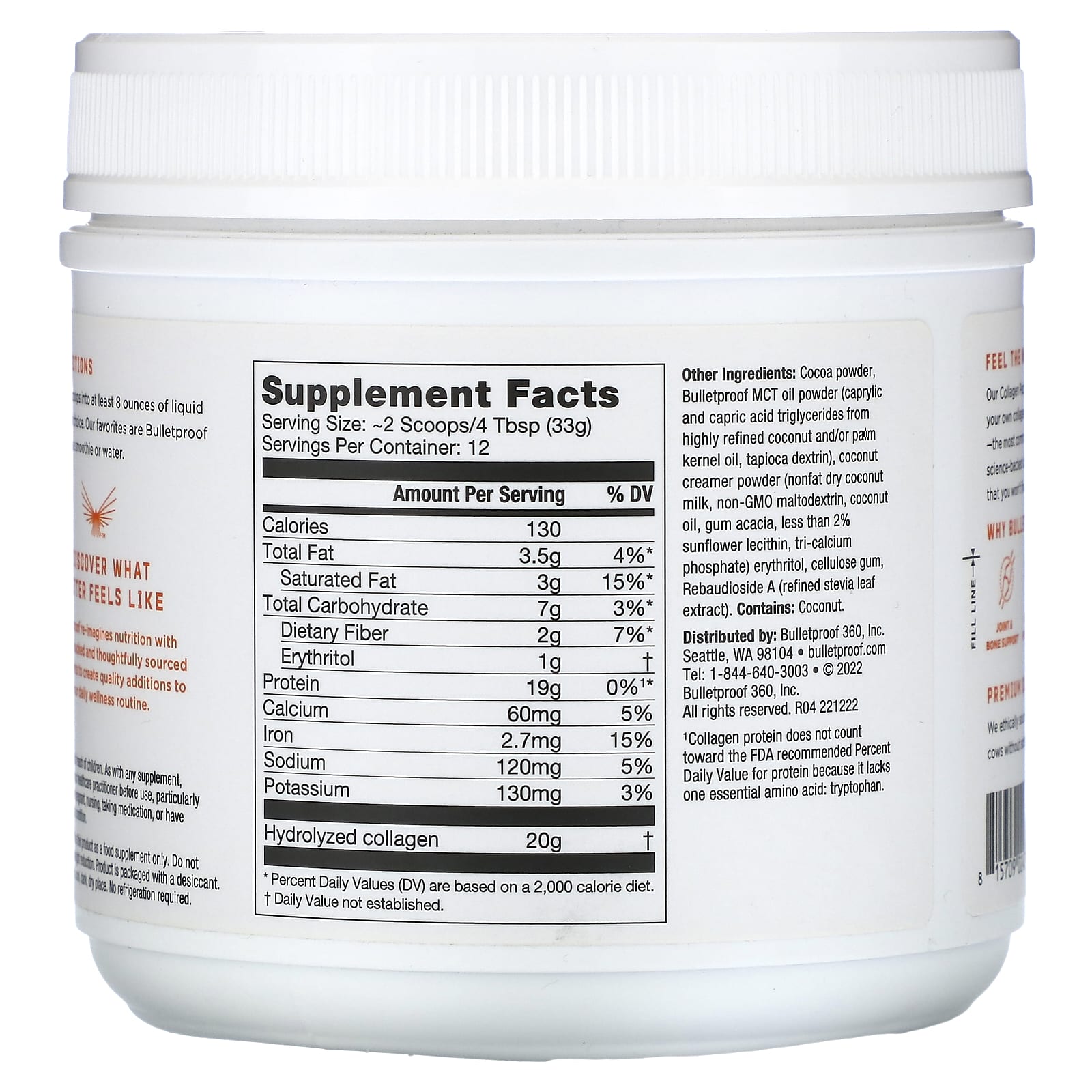 Какао-порошок, Пуленепробиваемый порошок из масла MCT (триглицериды каприловой и каприновой кислот из кокосового и/или пальмоядрового масла высокой степени очистки, тапиоковый декстрин), порошок из кокосовых сливок (обезжиренное сухое кокосовое молоко, мальтодекстрин без ГМО, кокосовое масло, аравийская камедь, менее 2% подсолнечного лецитина, трикальций фосфат) эритритол, целлюлозная камедь, ребаудиозид А (рафинированный экстракт листьев стевии).