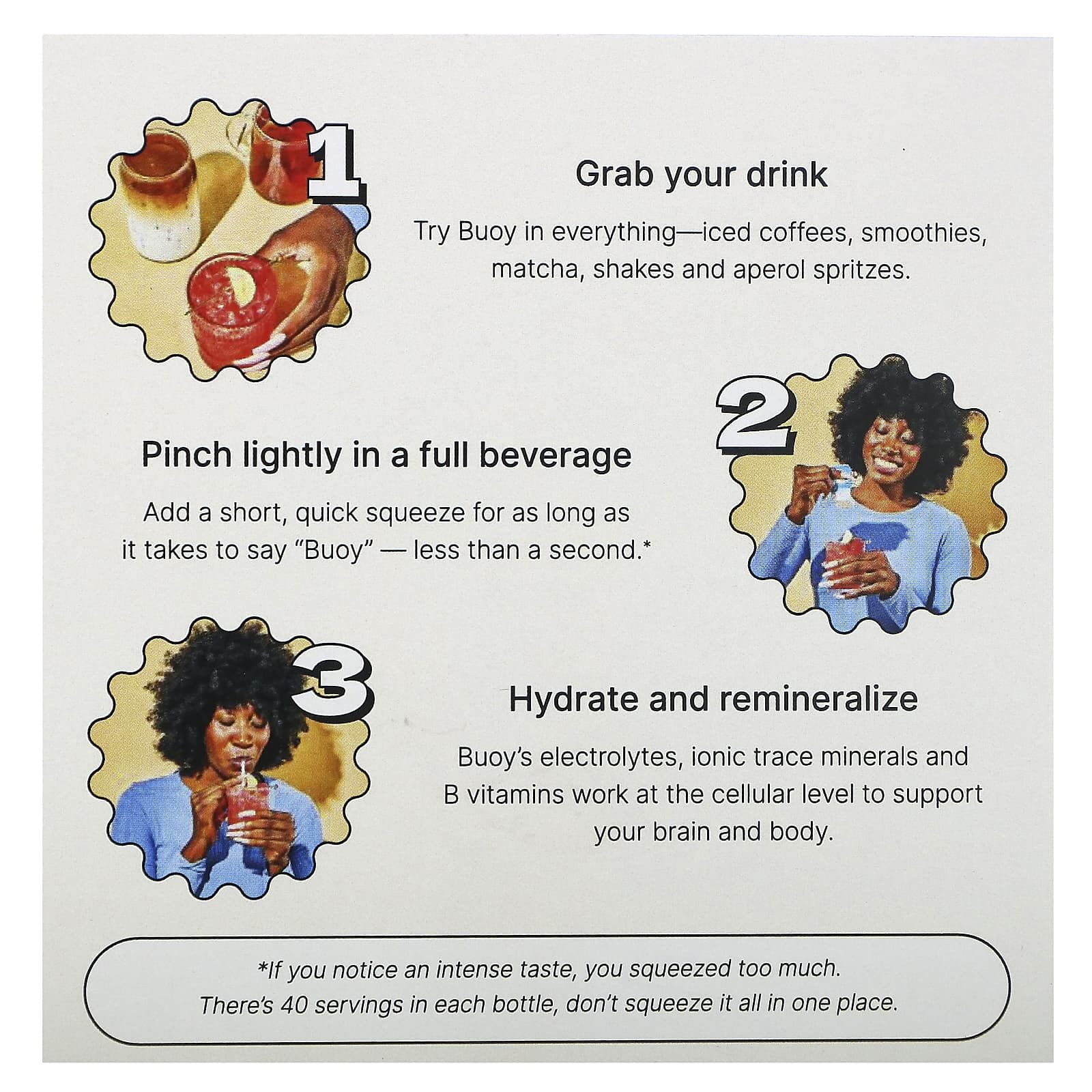 - Возьмите напиток - попробуйте Buoy во всем - в холодном кофе, смузи, матчах, коктейлях и апероле.