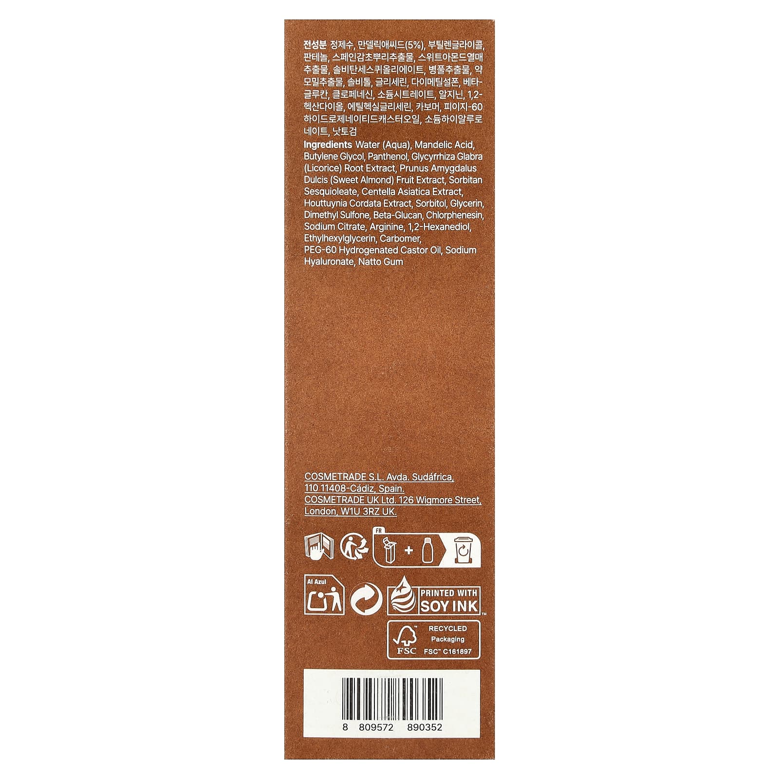 Вода, миндальная кислота, бутиленгликоль, пантенол, экстракт корня солодки (Glycyrrhiza glabra), экстракт плодов сладкого миндаля (Prunus amygdalus dulcis), сорбитана сесквиолеат, экстракт готу колы (Centella asiatica), экстракт хауттюйнии (Houttuynia cordata), сорбитол, глицерин, диметилсульфон, бета-глюкан, хлорфенезин, цитрат натрия, аргинин, 1,2-гександиол, этилгексилглицерин, карбомер, ПЭГ-60 гидрогенизированное касторовое масло, гиалуронат натрия, камедь натто.
