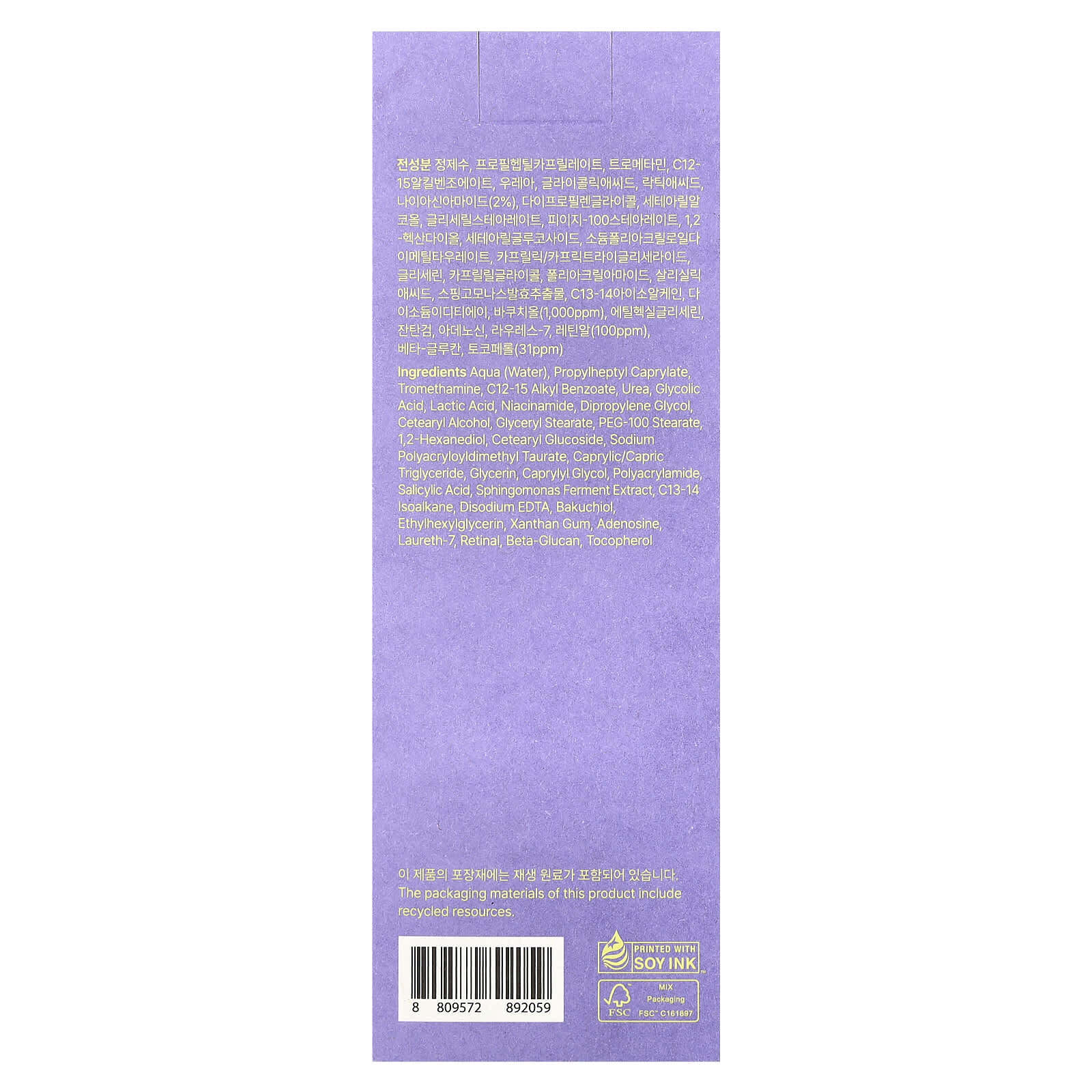 Вода (Aqua), пропилгептил каприлат, трометамин, c12-15 алкил бензоат, мочевина, гликолевая кислота, молочная кислота, никотинамид, дипропиленгликоль, цетеариловый спирт, глицерил стеарат, ПЭГ-100 стеарат, 1,2-гександиол, цетеариловый глюкозид, полиакрилодиметил таурат натрия, каприловый/каприновый триглицерид, глицерин, каприлилгликоль, полиакриламид, салициловая кислота, экстракт ферментов сфингомонаса (Sphingomonas), c13-14 изоалкан, двунатриевая ЭДТК, бакучиол, этилгексилглицерин, ксантановая камедь, аденозин, лаурет-7, сетчатке, бета-глюкан, токоферол.