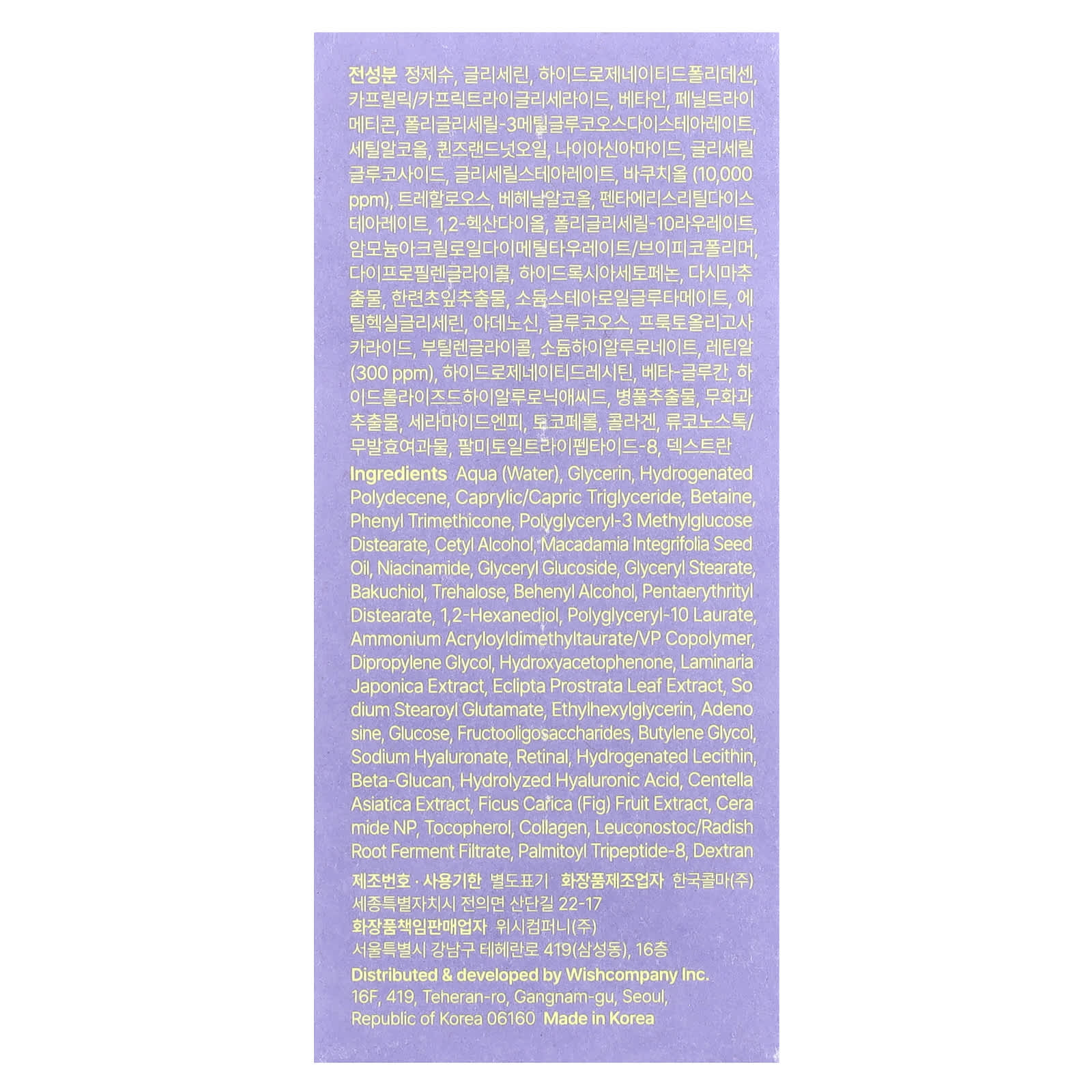 Вода (Aqua), глицерин, гидрогенизированный полидецен, каприловый/каприновый триглицерид, бетаин, фенилтриметикон, полиглицерил-3 метилглюкозы дистеарат, цетиловый спирт, масло макадамии (Macadamia integrifolia), никотинамид, глицерил глюкозид, глицерил стеарат, бакучиол, трегалоза, бегениловый спирт, пентаэритритил дистеарат, 1,2-гександиол, полиглицерил-10 лаурат, акрилоилдиметилтаурат аммония / ВП сополимер дипропиленгликоль, гидроксиацетофенон, экстракт ламинарии японской (Laminaria japonica), экстракт листьев эклипты простертой (Eclipta prostrata), натрия стеароил глутамат, этилгексилглицерин, аденозин, глюкоза, фруктоолигосахариды, бутиленгликоль, гиалуронат натрия, ретиналь, гидрогенизированный лецитин, бета-глюкан, гидролизованная гиалуроновая кислота, экстракт готу колы (Centella asiatica), экстракт плодов инжира (Ficus carica), керамид NP, токоферол, коллаген, лейконосток/ферментированный фильтрат корня редиса, пальмитоил трипептид-8, декстран.
