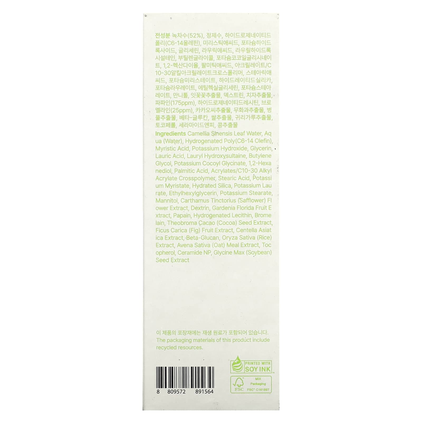 Вода из листьев зеленого чая (Camellia sinensis), вода (Aqua), гидрогенизированный поли (c6-14 олефин), миристиновая кислота, гидроксид калия, глицерин, лауриновая кислота, лаурил гидроксисултаин, бутиленгликоль, кокоил глицинат калия, 1,2-гександиол, пальмитиновая кислота, акрилат/c10-30 алкил акрилат кроссполимер, стеариновая кислота, миристат калия, гидратированный диоксид кремния, лаурат калия, этилгексилглицерин, стеарат калия, маннит, экстракт цветков сафлора (Carthamus tinctorius), декстрин, экстракт плодов гардении жасминовидной (Gardenia florida), папаин, гидрогенизированный лецитин, бромелаин, экстракт зерен какао (Theobroma cacao), экстракт плодов инжира (Ficus carica), экстракт готу колы (Centella asiatica), бета-глюкан, экстракт риса (Oryza sativa), экстракт овсяной муки (Avena sativa), токоферол, керамид NP, экстракт семян сои (Glycine max).