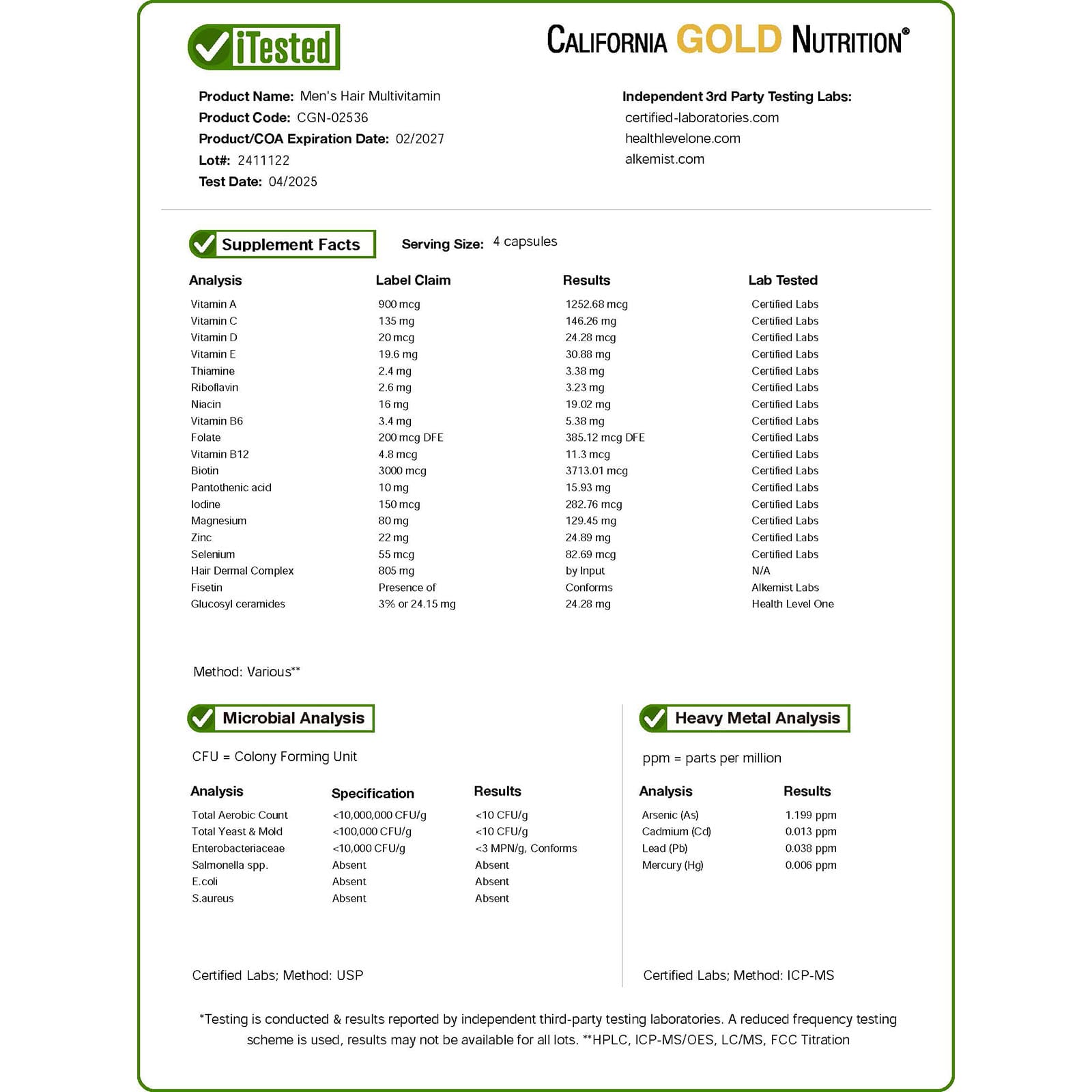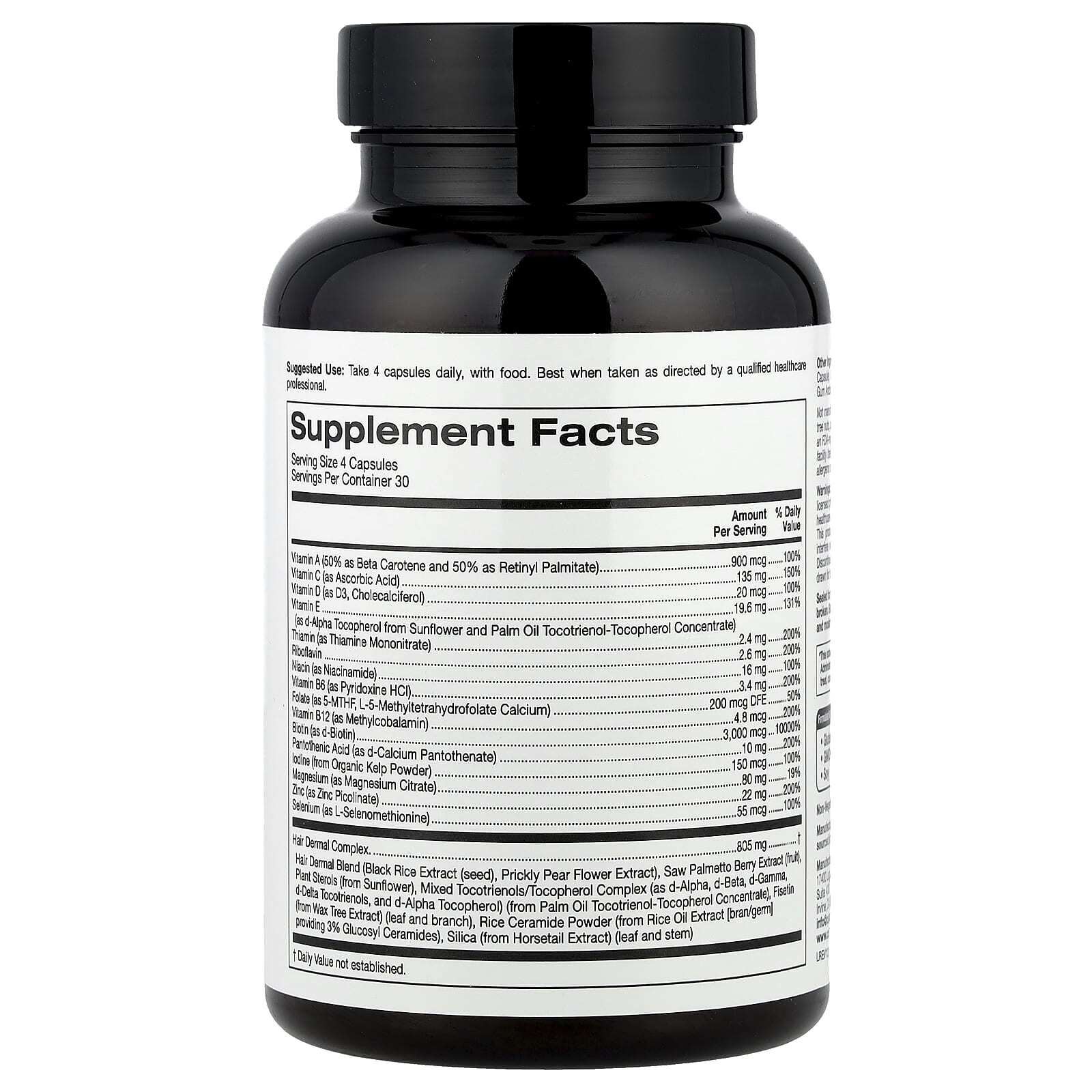 Витамин A (50% в виде бета-каротина и 50% в виде ретинилпальмитата), Витамин C (в виде аскорбиновой кислоты), витамин D (в виде витамина D3, холекальциферола), Витамин E (в виде d-альфа токоферола из концентрата токотриенолов и токоферолов подсолнечного и пальмового масла), Тиамин (в виде мононитрата тиамина), Рибофлавин, Ниацин (в виде никотинамида), Витамин B6 (в виде пиридоксина гидрохлорида), фолат (в виде 5-MTHF, L-5-метилтетрагидрофолат кальция), Витамин В12 (в виде метилкобаламина), биотин (в виде d-биотина), Пантотеновая кислота (в виде d-пантотената кальция), Йод (из порошка органических водорослей), Магний (в виде цитрата магния), Цинк (в виде пиколината цинка), Селен (в виде L-селенометионина), кожный комплекс для волос: Дермальная смесь для волос (экстракт черного риса (семена), Экстракт цветков опунции), Экстракт ягод серенои (плоды), растительные стеролы (из подсолнечника), Смешанный комплекс токотриенолов / токоферолов (в виде d-альфа, d-бета, d-гамма, d-дельта токотриенолы, d-альфа токоферол) (из концентрата токотриенола и токоферола пальмового масла), Физетин (из экстракта воскового дерева) (листья и ветки), Порошок рисовых керамидов (из экстракта рисового масла [отруби / зародышей], содержащий 3% глюкозил керамидов), Диоксид кремния (из экстракта хвоща) (листья и стебель).