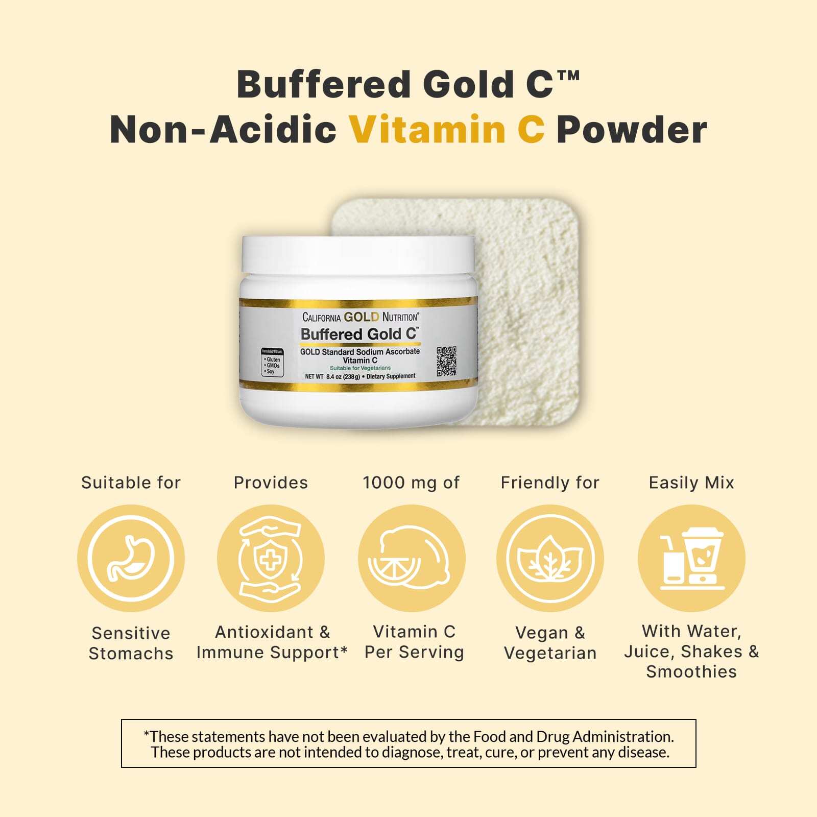 Buffered Gold C™ от California Gold Nutrition представляет собой некислую форму витамина C в форме аскорбата натрия. Буферизованный витамин C в форме порошка — это простой и экономичный способ получить индивидуальную дозу витамина C для людей с чувствительной пищеварительной системой. Buffered Gold C™ можно смешивать с водой, соком или другими напитками.