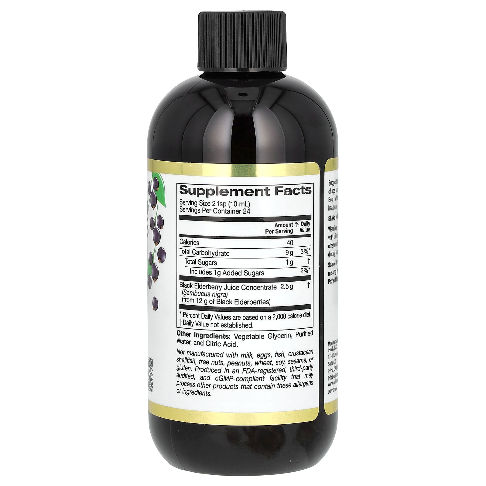 California Gold Nutrition содержит сок Sambucus Nigra, полученный из 12 000 мг европейской черной бузины и выпаренный до 2500 мг в каждой порции. Данная добавка не содержит искусственных подсластителей и искусственных консервантов.