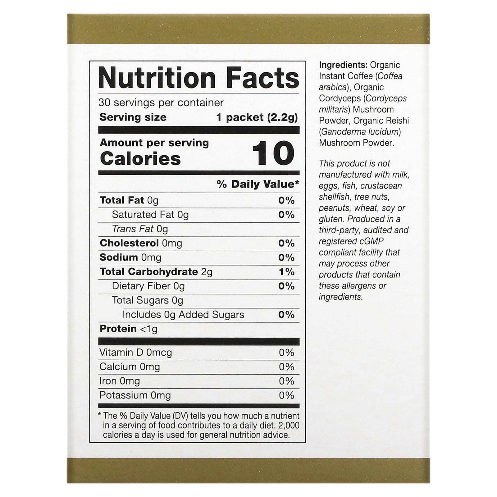 Органический растворимый кофе (арабика), порошок из органических грибов кордицепс (Cordyceps militaris), порошок из органических грибов рейши (Ganoderma lucidum).