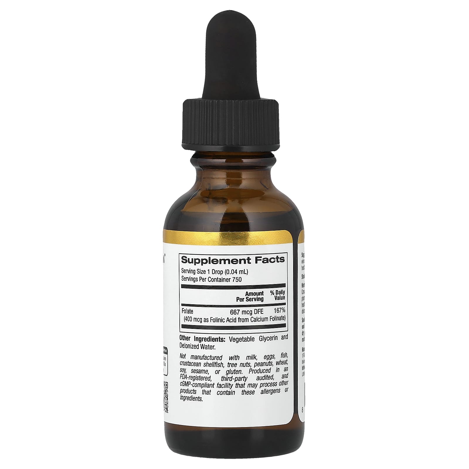 Фолиновая кислота от California Gold Nutrition — это биоактивная форма фолата в виде жидкости без спирта. Каждая капля содержит 667 мкг DFE (что составляет 167% от суточной нормы фолата для человека, установленной Министерством здравоохранения и социальных служб США).