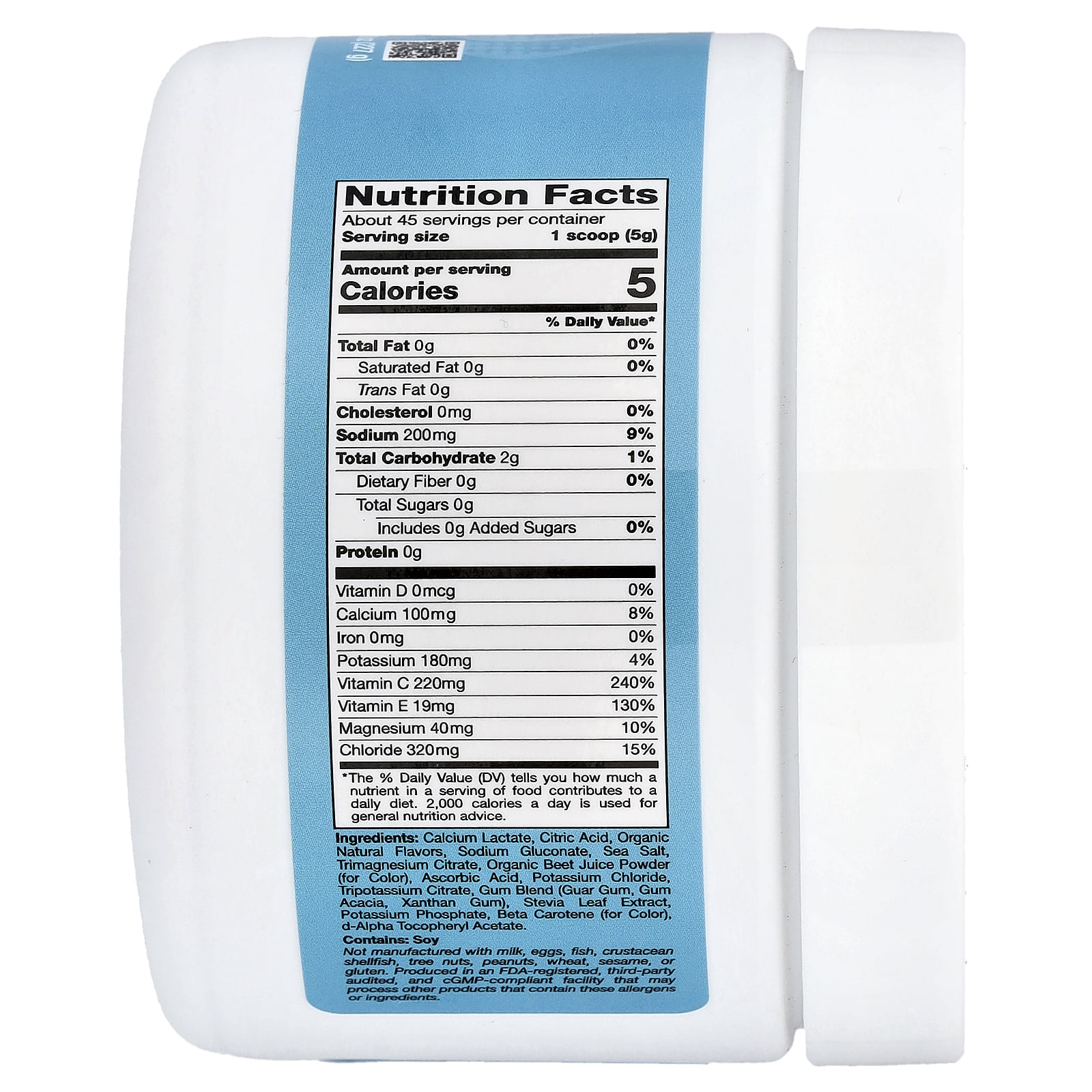 Лактат кальция, лимонная кислота, органический натуральный ароматизатор, глюконат натрия, морская соль, цитрат тримагния, порошок из сока органической свёклы (краситель), аскорбиновая кислота, хлорид калия, цитрат калия 3-замещенный, смесь камеди (гуаровая камедь, аравийская камедь, ксантановая камедь), экстракт листьев стевии, фосфат калия, бета-каротин (краситель), d-альфа токоферилацетат.