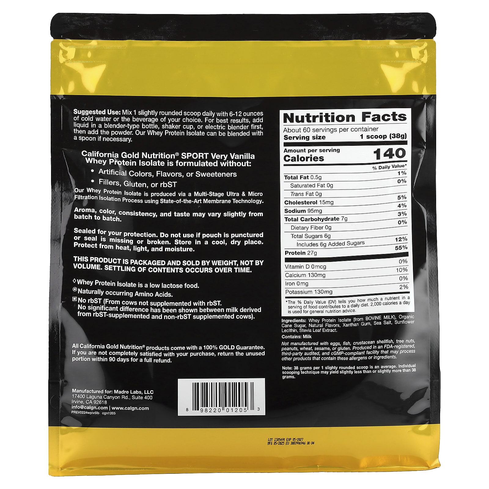 - California Gold Nutrition Sportизолят сывороточного протеина со вкусом ванили, 2,27 кг (5 фунтов)
