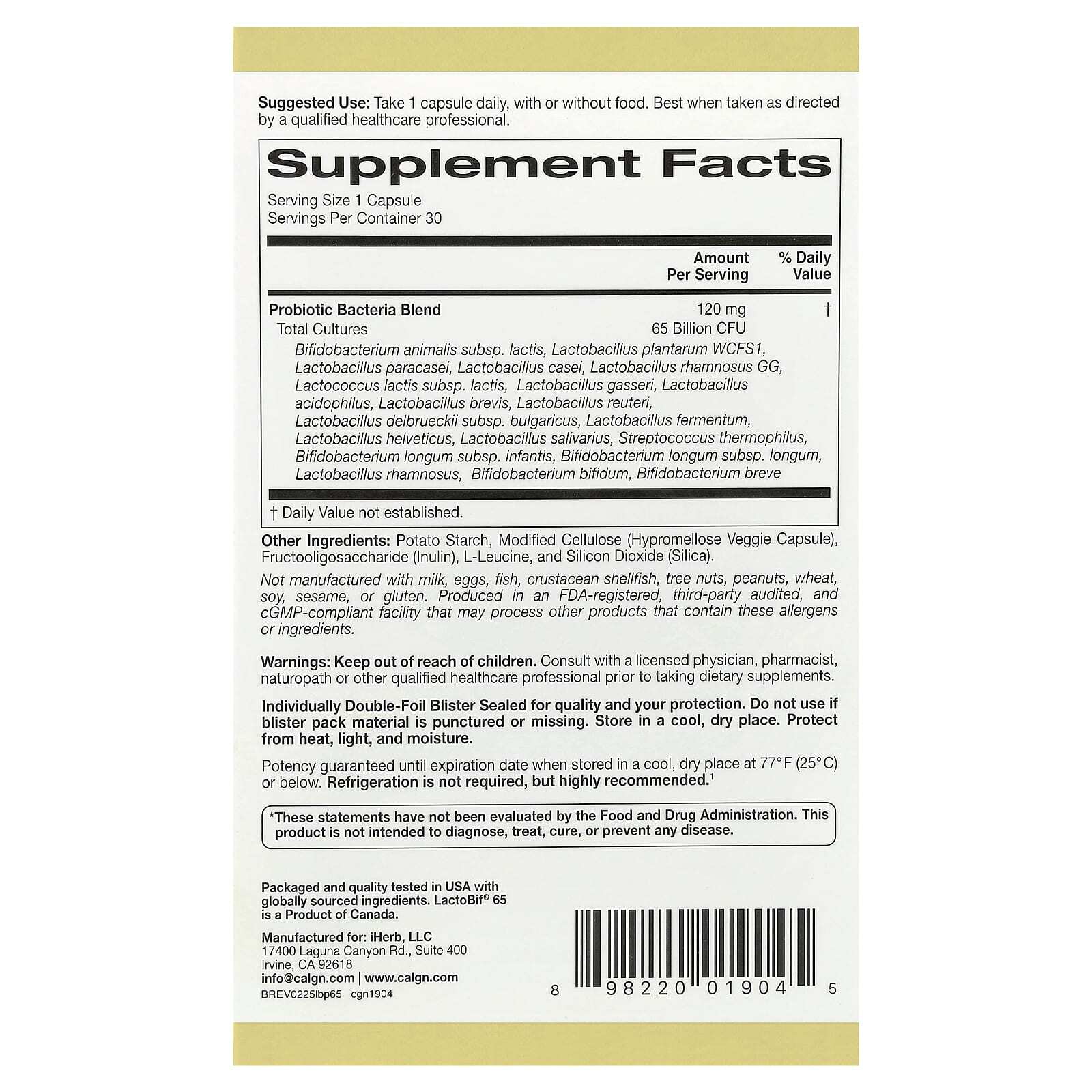 В вашем организме живёт много полезных бактерий, которые поддерживают важные функции, однако ваш естественный микробиом может утратить баланс, что часто приводит к неприятным проблемам с пищеварением. Пробиотики LactoBif® 65 от California Gold Nutrition могут помочь поддерживать баланс в кишечнике благодаря большему количеству полезных бактерий, что способствует здоровью пищеварительной и иммунной систем и потенциально облегчает распространённые проблемы с пищеварением*.