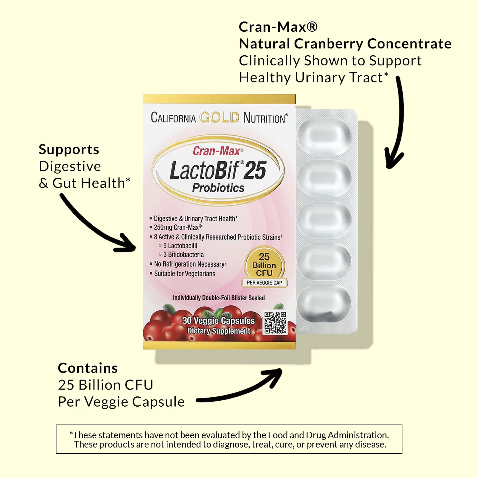 Пробиотики Cran-Max® LactoBif от California Gold Nutrition содержат пробиотики и клюквенный концентрат в растительных капсулах. Они индивидуально запечатаны в блистерную упаковку с двойной фольгой, что помогает защитить ингредиенты и делает этот продукт стабильным при хранении без необходимости хранить в холодильнике.2