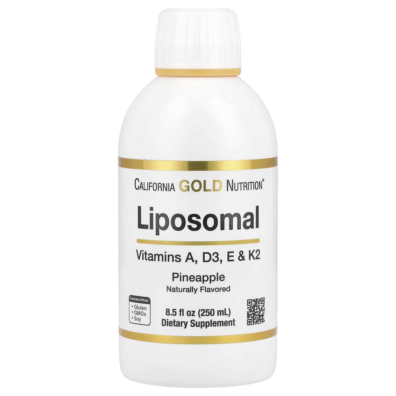 Липосомальные витамины A, D3, E и K2 от California Gold Nutrition содержатся в липосомальной смеси и имеют натуральный ананасовый вкус. Жидкую добавку с витаминами удобно добавлять в свой рацион. Просто примите в неразбавленном виде или добавьте ее в сок или воду.