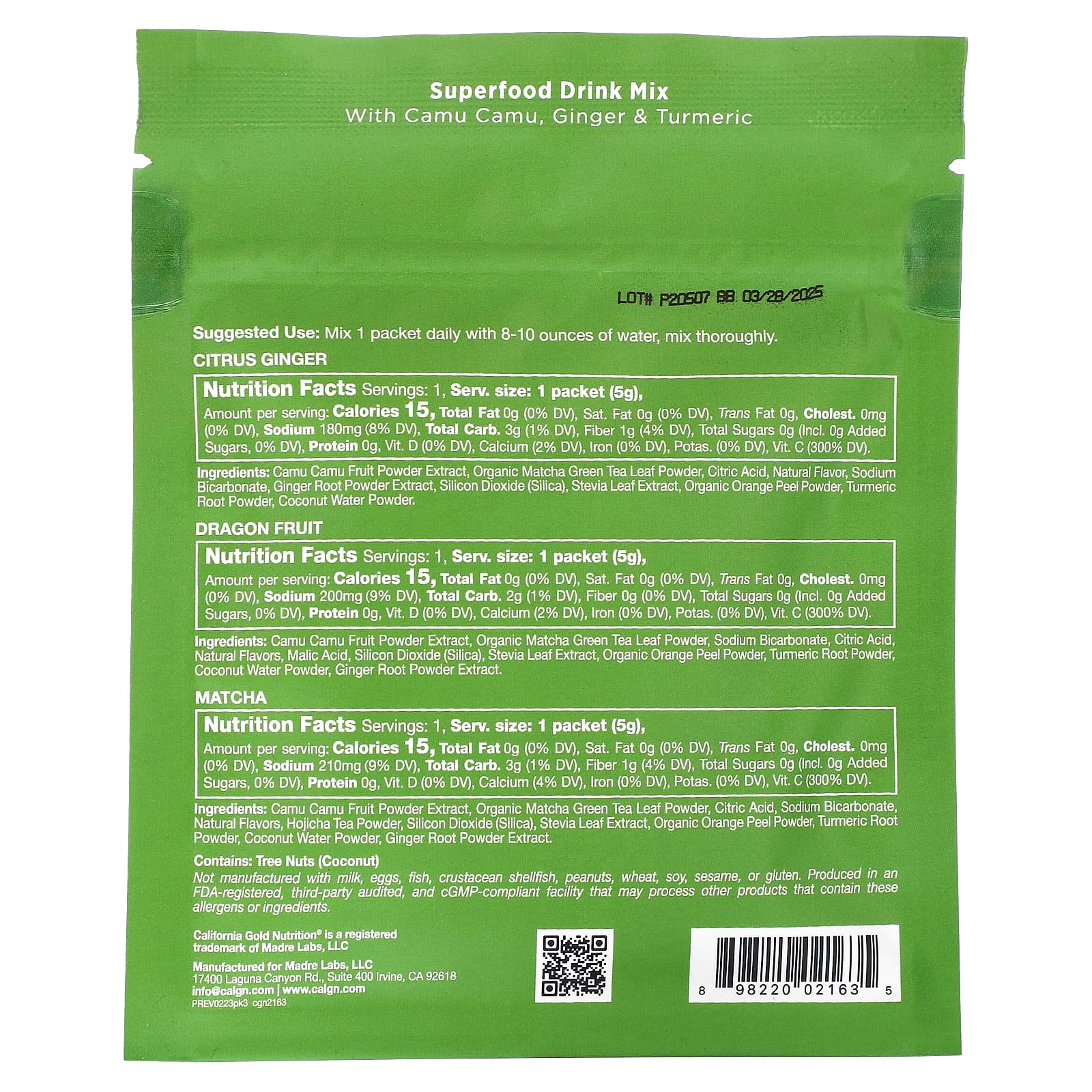 Матча с витамином C Matcha Road от California Gold Nutrition состоит из качественных ингредиентов и не содержит глютена, ГМО и сои. Эта упаковка пробников содержит 3 восхитительных вкуса: без добавок, цитрус и имбирь, питахайя.