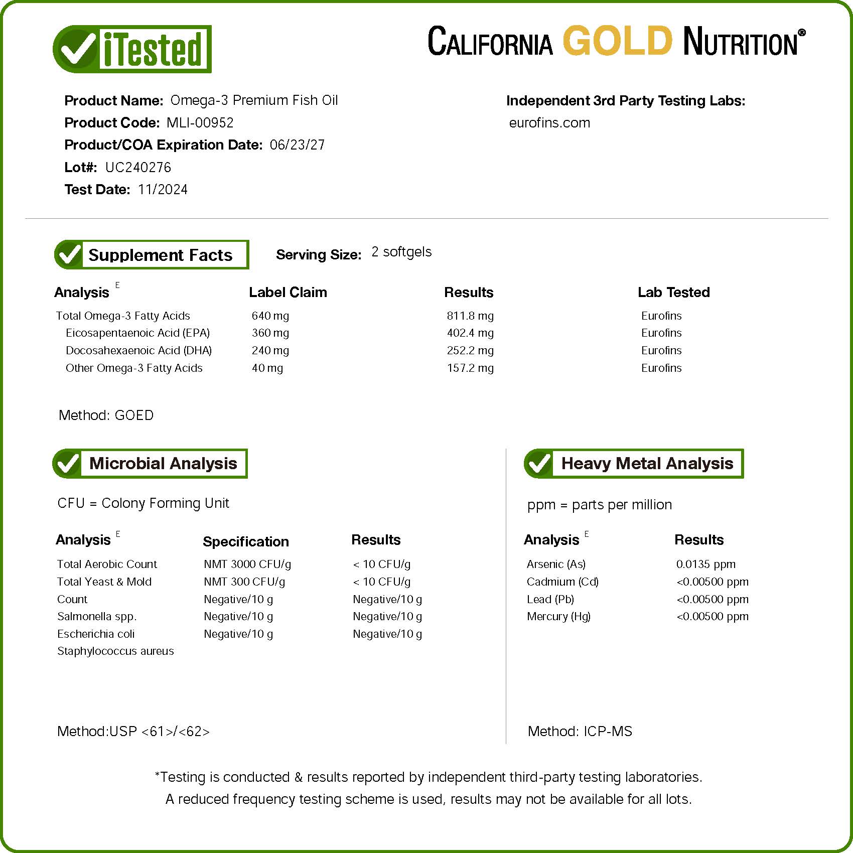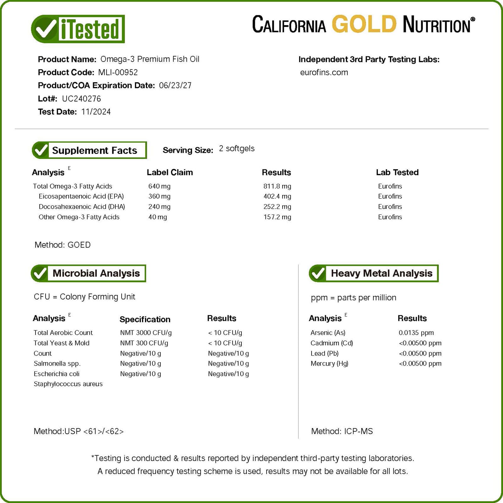 Содержащийся в капсулах омега-3 концентрат рыбьего жира производится в соответствии со строгими стандартами контроля качества и проверен на отсутствие загрязняющих веществ (например, тяжелые металлы [ртуть], ПХБ, диоксины, другие примеси).