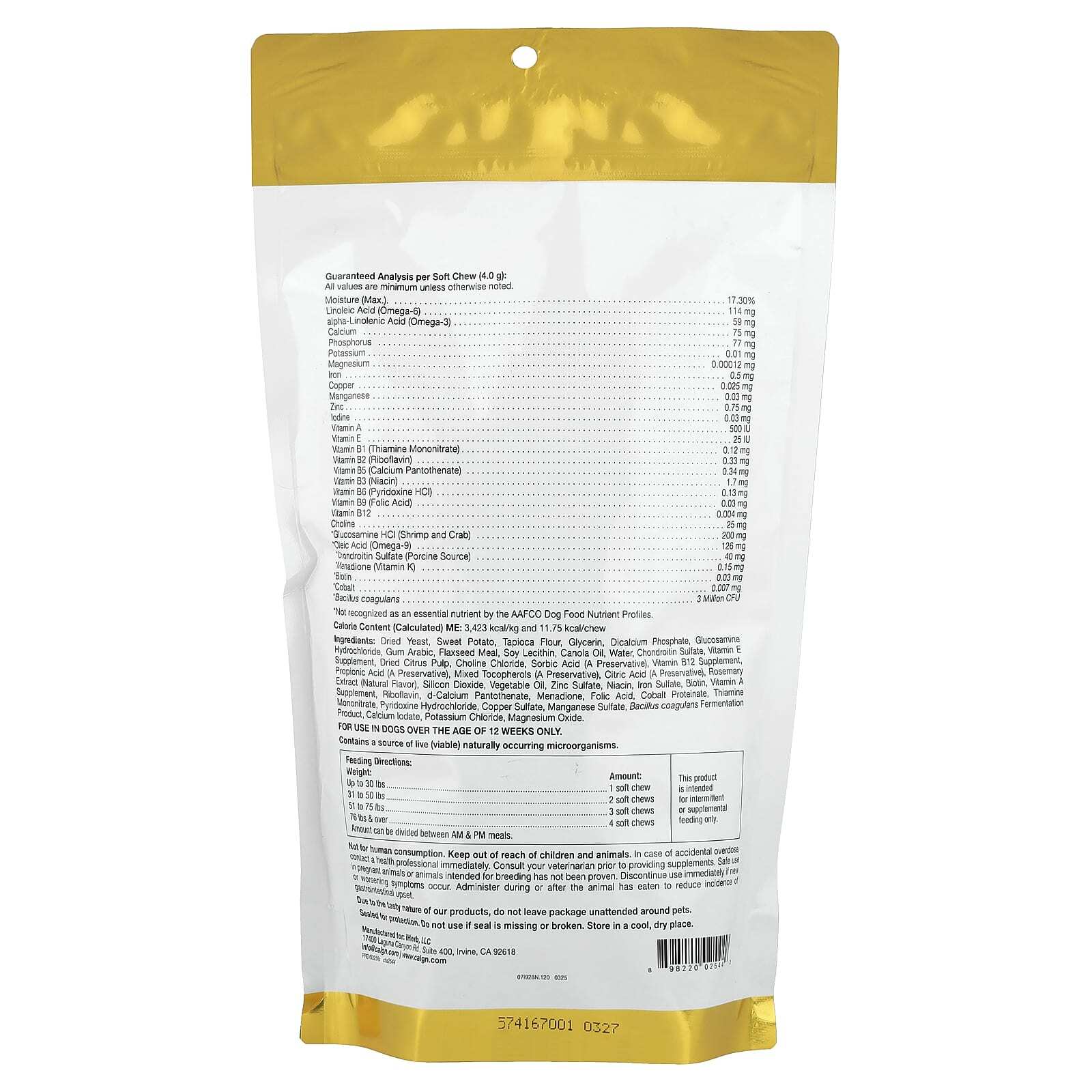 Пищевая добавка 4 в 1 в виде жевательных таблеток California Gold Nutrition® Pet разработана для поддержки общего состояния здоровья собак. Эти жевательные таблетки помогают вашему пушистому другу лучше выглядеть и лучше себя чувствовать, поскольку они содержат витамины и минералы, пробиотики, глюкозамин, хондроитин и жирные кислоты омега, которые помогают поддержать 4 основных аспекта здоровья.