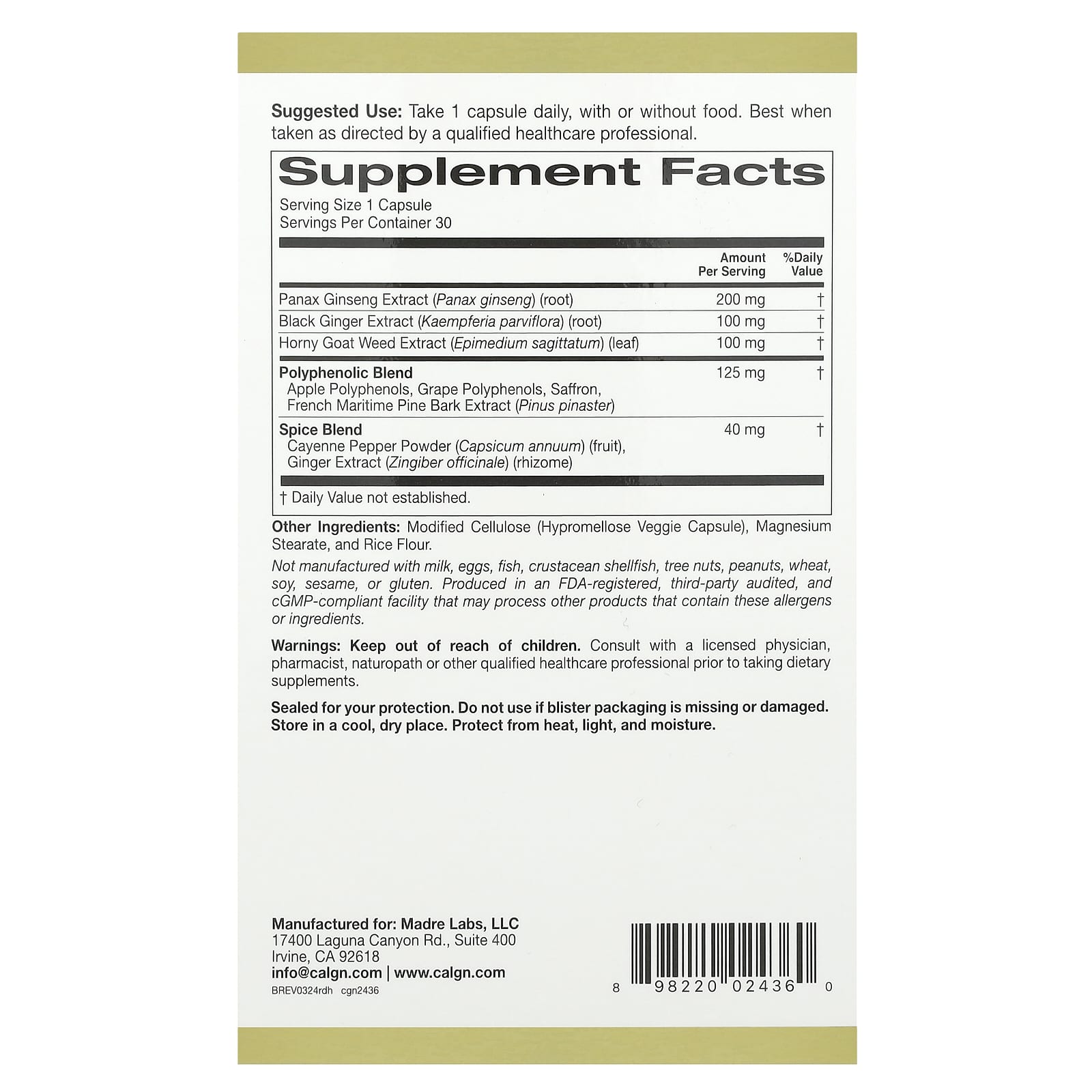 Экстракт женьшеня (Panax ginseng) (корень), Экстракт черного имбиря (Kaemoferia parviflora) (корень), Экстракт роговой козы (Epimedium sagittatum) (лист), смесь полифенолов: Полифенолы яблока, Полифенолы винограда, Шафран, Экстракт коры французской приморской сосны (Pinus pinaster); Смесь специй: Порошок кайенского перца (Capsicum annuum) (плоды), экстракт корневища имбиря аптечного (Zingiber officinale)