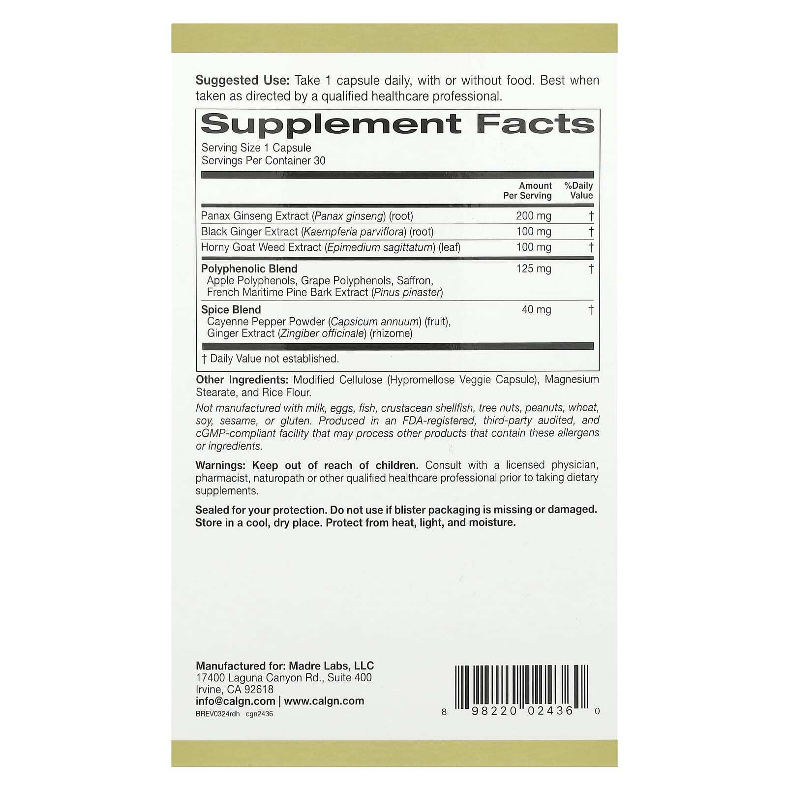 При производстве не используется молоко, яйца, рыба, моллюски и ракообразные, древесные орехи, арахис, пшеница, сои, кунжут, глютен. Произведено на предприятии, имеющем регистрацию Управления по контролю качества пищевых продуктов и лекарственных средств США, которое проходит независимые проверки, имеет регистрацию текущей надлежащей производственной практики (cGMP), и где также могут обрабатываться другие продукты, содержащие эти аллергены или ингредиенты.