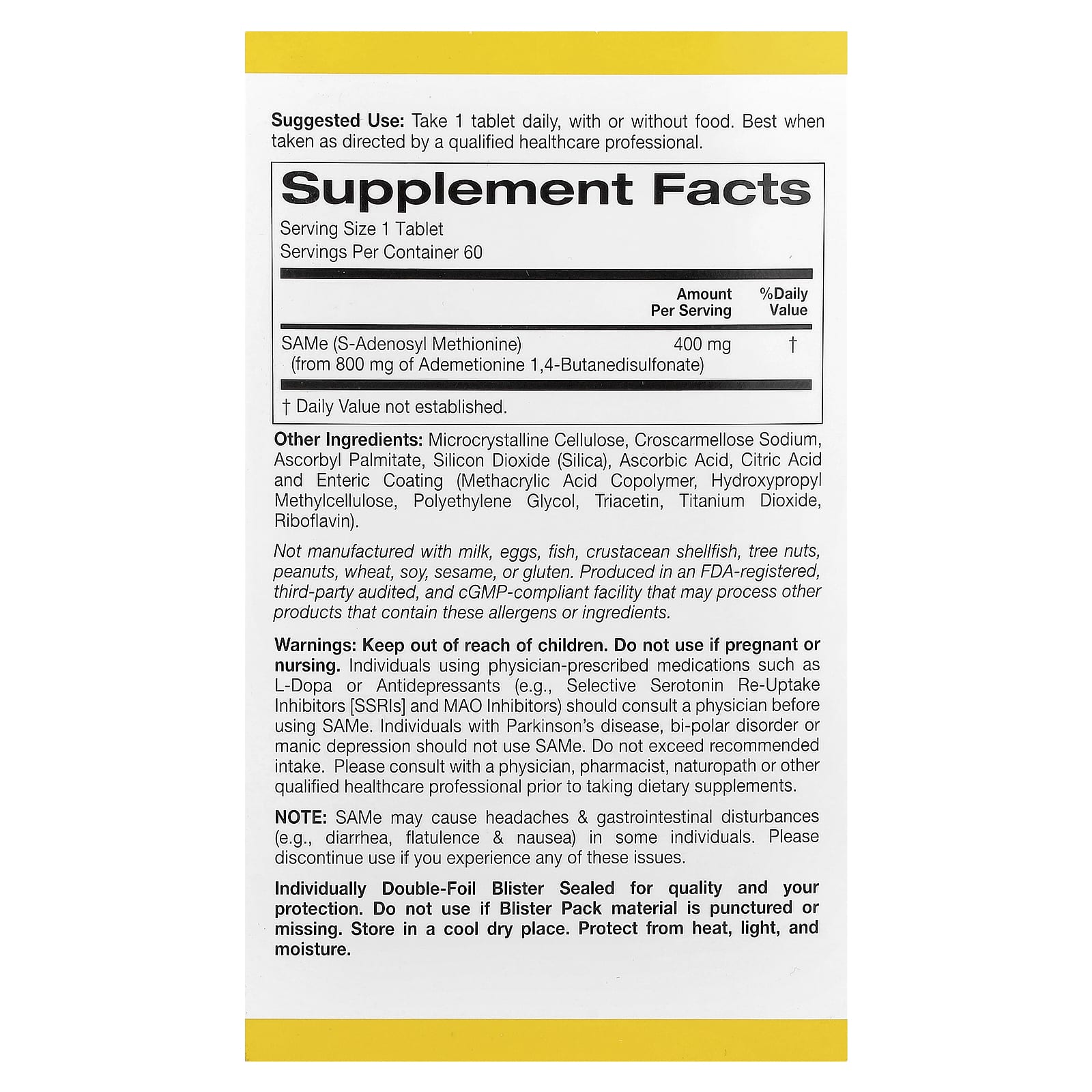 Хранить в недоступном для детей месте. Не используйте, если вы беременны или кормите грудью. Лица, принимающие прописанные врачом лекарства, такие как L-допа или антидепрессанты (например, селективные ингибиторы обратного захвата серотонина [СИОЗС] и ингибиторы МАО), должны проконсультироваться с врачом перед применением SAMe. Лицам с болезнью Паркинсона, биполярным расстройством или маниакальной депрессией не следует использовать SAMe. Не превышайте рекомендуемую дозировку. Перед приемом пищевых добавок проконсультируйтесь с врачом, фармацевтом, натуропатом или другим квалифицированным медицинским работником.