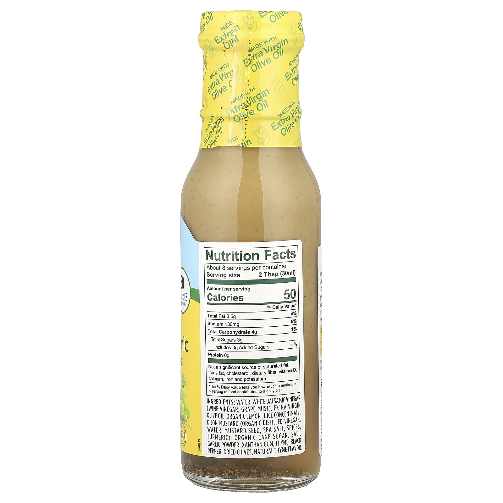 Вода, белый бальзамический уксус (винный уксус, виноградное сусло), оливковое масло холодного отжима, концентрат органического лимонного сока, дижонская горчица (органический дистиллированный уксус, вода, семена горчицы, морская соль, специи, куркума), органический тростниковый сахар, соль, чесночный порошок, ксантановая камедь, чабрец, черный перец, сушеный шнитт-лук, натуральный ароматизатор «Чабрец».