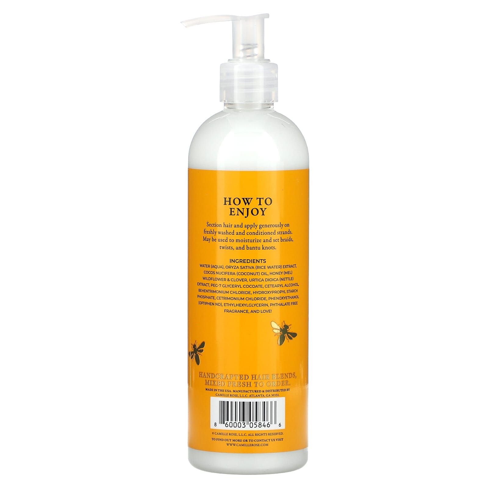 Вода (Aqua), экстракт рисовой воды (Oryza sativa), кокосовое масло (Cocos nucifera), мед (мел), полевые цветы клевер, экстракт крапивы двудомной (Urtica dioica), ПЭГ-7 глицерил кокоат, цетеариловый спирт, бегентримония хлорид, гидроксипропил фосфат крахмала, цетримония хлорид, феноксиэтанол (Optiphen nd), этилгексилглицерин, отдушка без фталатов, и любовь!