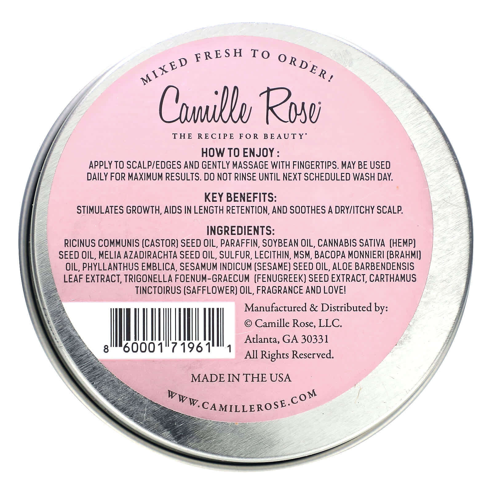 Касторовое масло (Ricinus communis), парафина, соевое масло, конопляное масло (Cannabis sativa), масло из семян нима (Melia azadirachta), сера, лецитин, метилсульфонилметан, масло брахми (Bacopa monnieri), амлы (Phyllanthus emblica), кунжутное масло (Sesamum indicum), экстракт листьев алоэ вера (Aloe barbadensis), экстракт семян пажитника (Trigonella foenum-graecum), масло сафлоровое (Carthamus tinctorius), аромат и любовь!