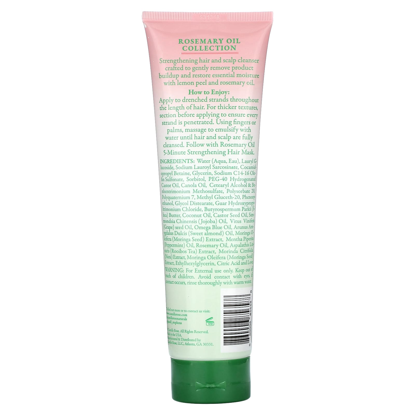 Вода (Aqua, eau), лаурил глюкозид, лауроилсаркозинат натрия, кокамидопропилбетаин, глицерин, натрия С14-16 олефин сульфонат, сорбитол, ПЭГ-40 гидрогенизированное касторовое масло, рапсовое масло, цетеариловый спирт и б)енгентримония метосульфат, полисорбат 20, поликватерниум-7, метил глюцет-20, феноксиэтанол, гликоль дистеарат, гуар гидроксипропилтримония хлорид, масло ши (Butyrospermum parkii), кокосовое масло, касторовое масло, масло жожоба (Simmondsia chinensis), масло из косточек винограда (Vitus vinifera), масло омега голубое, масло сладкого миндаля (Arunus amygdalus dulcis), экстракт семян моринги (Moringa oleifera), масло перечной мяты (Mentha piperita), масло розмарина, экстракт чая ройбуша (Aspalathis lincaris), экстракт нони (Morinda citrifolia), экстракт семян моринги (Moringa oleifera), этилгексилглицерин, лимонная кислота.