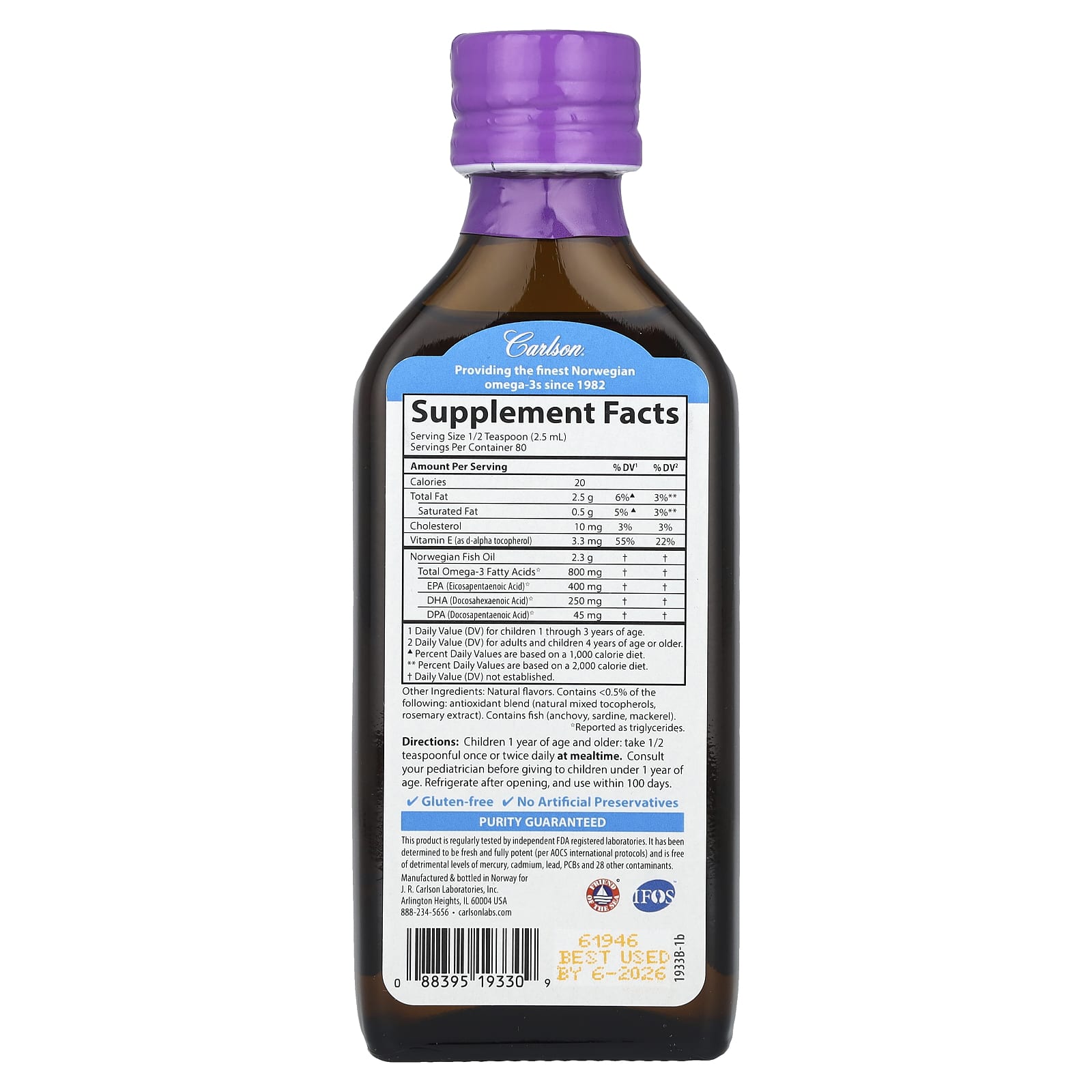 Этот продукт регулярно проходит проверки в независимых лабораториях, зарегистрированных Управлением по контролю качества пищевых продуктов и лекарственных средств США (FDA). Его свежесть, максимальная эффективность (согласно международным протоколам AOCS) и отсутствие вредных концентраций ртути, кадмия, свинца, ПХБ и 28 других загрязняющих веществ гарантированы.
