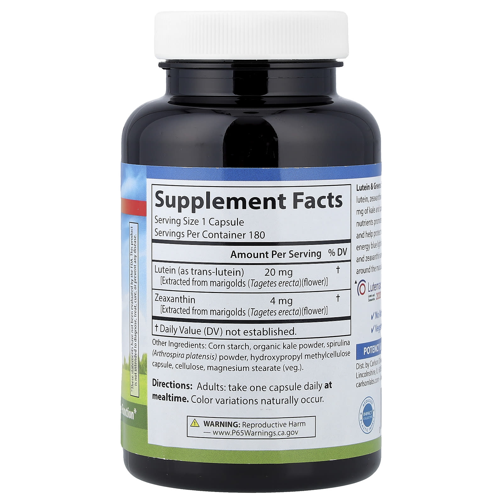 Смеси с лютеином и зеленью Lutemax 2020, содержит лютеин, зеаксантин и мезо-зеаксантин, а также 260 мг кудрявой капусты и спирулины. Вместе эти эффективные питательные вещества способствуют здоровому излучению и работе глаз, а также помогают защитить глаза от вредного высокоэнергетического синего света и использования цифровых устройств. Лютеин и зеаксантин в больших количествах содержатся в макуле и вокруг нее, области, жизненно важной для здорового зрения.