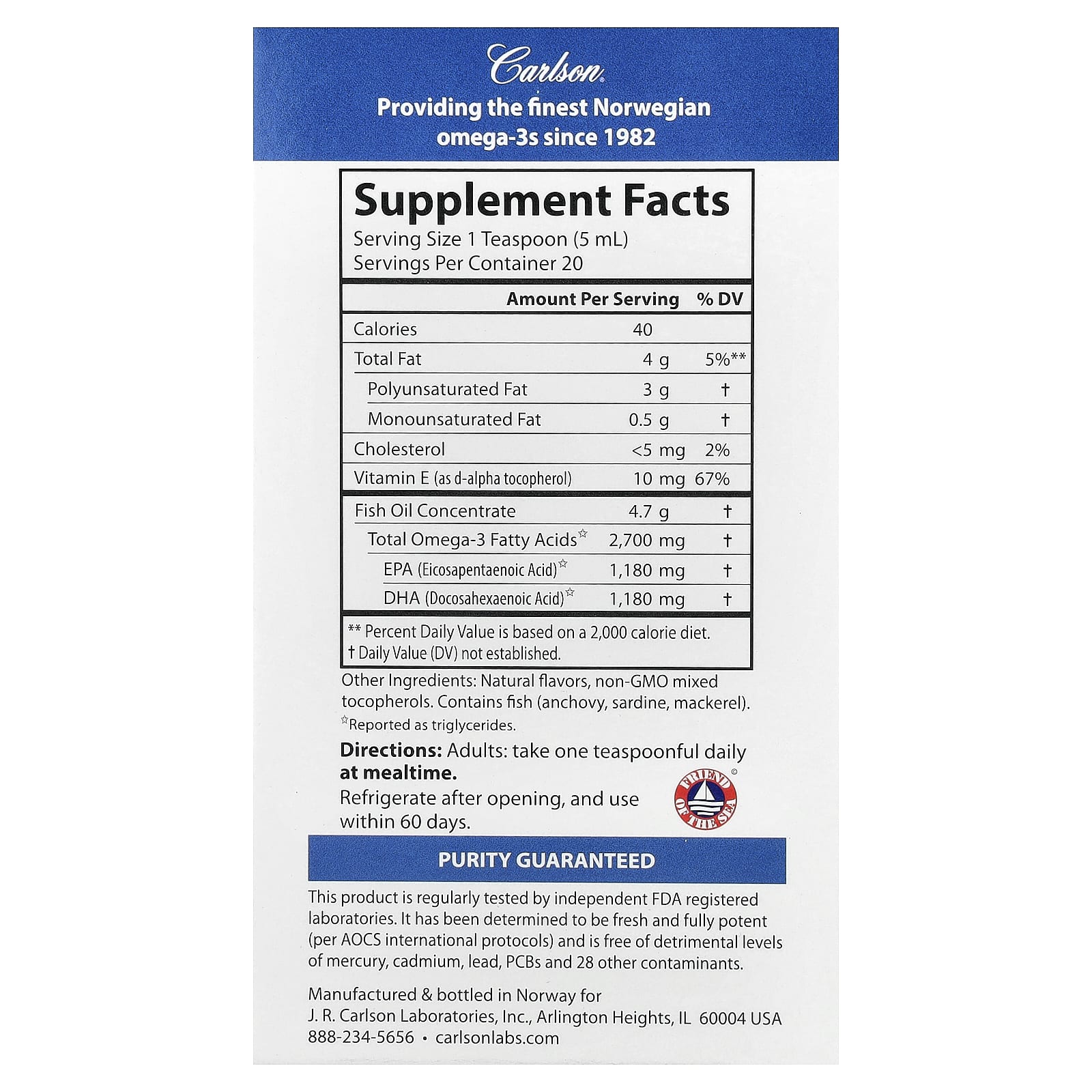 Гарантия чистоты.Этот продукт регулярно проходит проверки в независимых лабораториях, зарегистрированных Управлением по контролю качества пищевых продуктов и лекарственных средств США (FDA).Его свежесть, максимальная эффективность (согласно международным протоколам AOCS) и отсутствие вредных концентраций ртути, кадмия, свинца, ПХБ и 28 других загрязняющих веществ гарантированы.