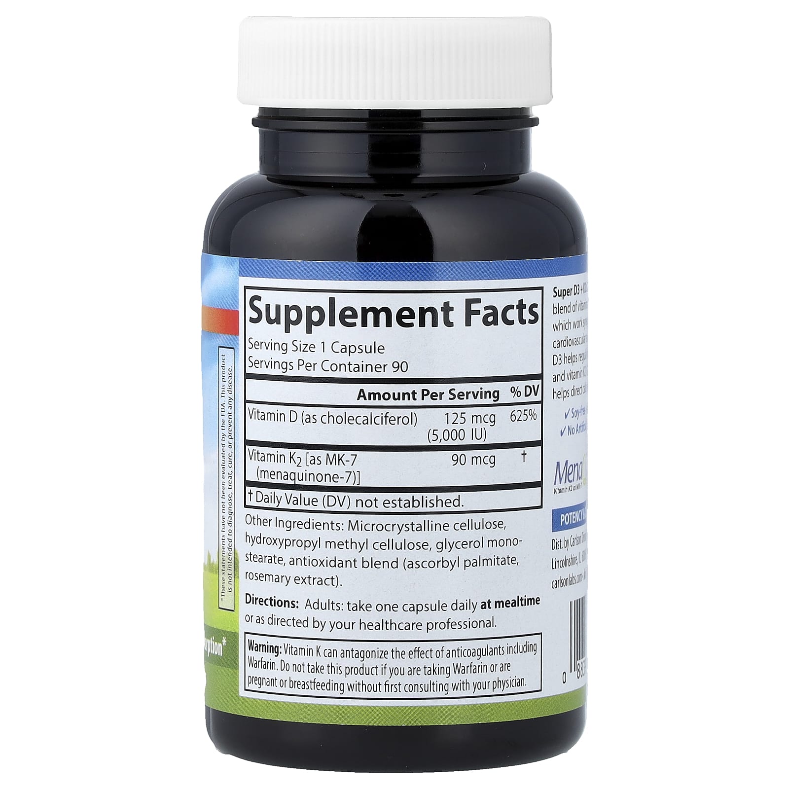 Super D3 + K2 содержит высокоэффективную смесь витаминов D3 и K2 в виде МК-7, которые работают синергетически, поддерживая здоровье сердечно-сосудистой системы и костей. Витамин D3 помогает регулировать усвоение кальция, а витамин K2, полученный из нута, помогает направлять кальций в кости.