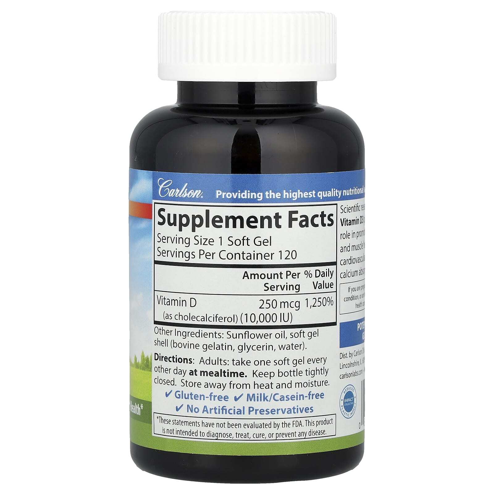 Витамин D (в виде холекальциферола) | 250 мкг (10 000 МЕ) | 1250% |