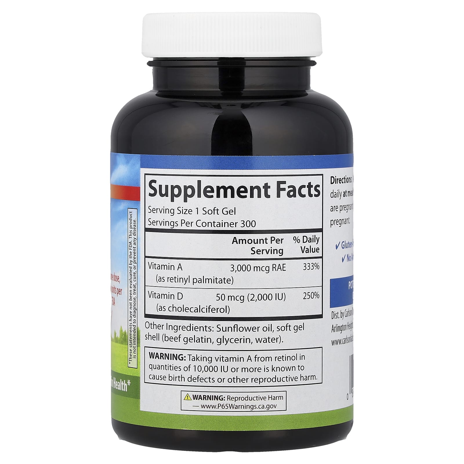 Витамин A и D содержит 10 000 МЕ (3000 мкг RAE) витамина A из пальмитата и 2000 МЕ (50 мкг) витамина D3 из холекальциферола для поддержки здорового зрения и работы иммунной системы.