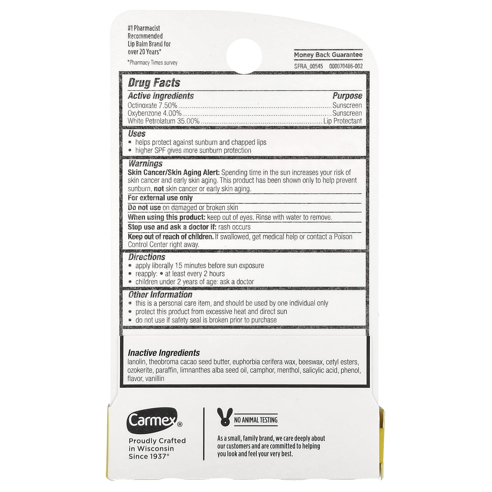 | Неактивные ингредиенты ланолин, масло какао из семян какао (Theobroma cacao), воск из молочая (Euphorbia cerifera), пчелиный воск, цетиловые эфиры, озокерит, парафин, масло семян лайма (Limnanthes alba), камфора, ментол, салициловая кислота, фенол, ароматизатор, ванилин. | |
